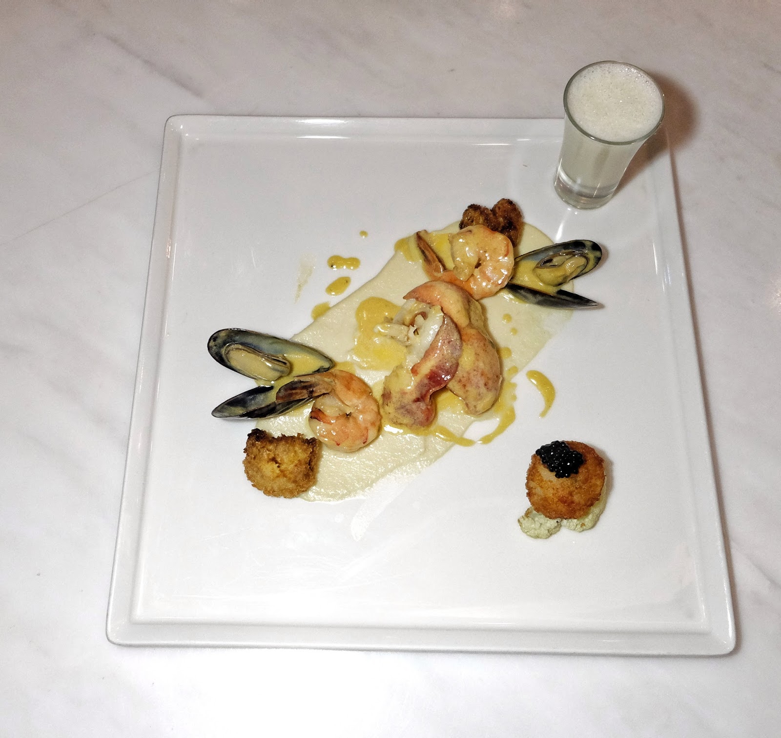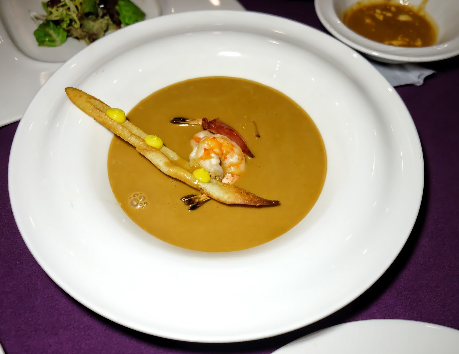 法式海龍皇湯配蝦、青口、法式麵包多士及黃薑粉蛋黃醬