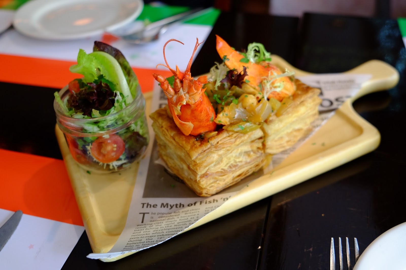 賣相誘人,就連墊底的報紙,亦印上酒店名,相當細心,酥盒一刀切落,已聽到清脆的破裂聲,無花無假,連同龍蝦肉一齊食,真是人間美味。