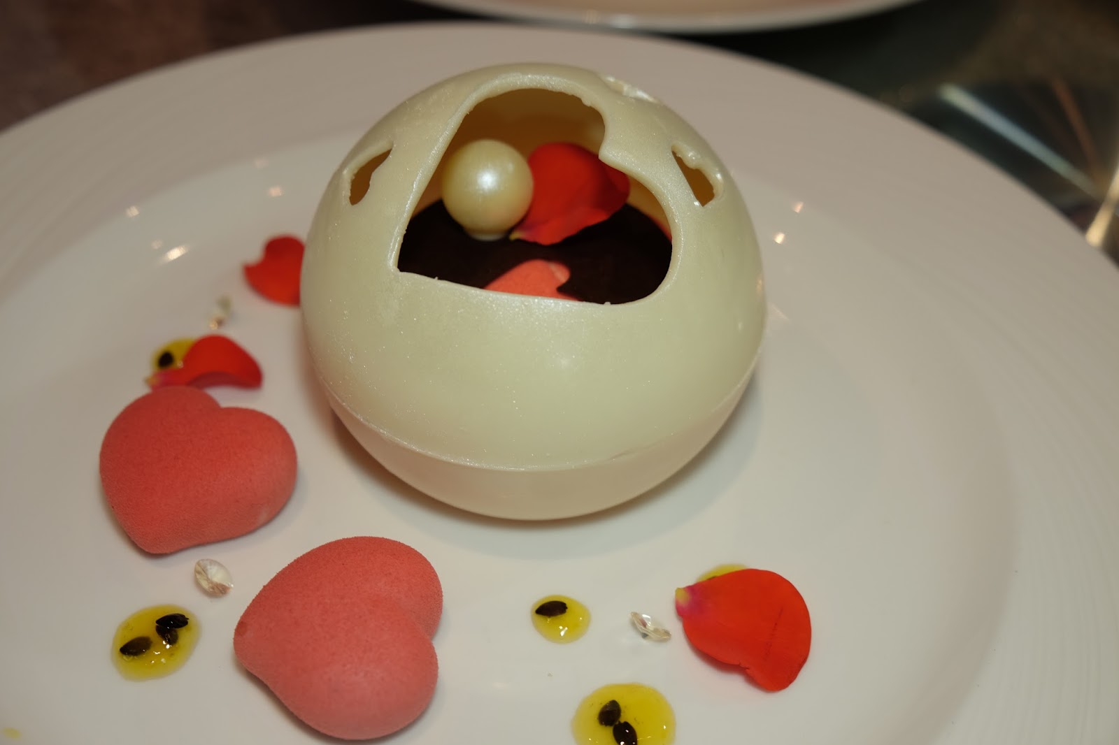 至於甜品當然是情人節套餐不可缺少的元素,伴碟的心心係雜莓慕絲蛋糕,質感鬆軟香滑,而主題的圓形白朱古力球入面係熱情果啫喱白朱古力慕絲蛋糕,切開一半便見到層次分明,夾心熱情果軟綿幼滑,跟愛侶分享甜蜜的一刻,共渡醉人浪漫的晚上,正是最好不過!
