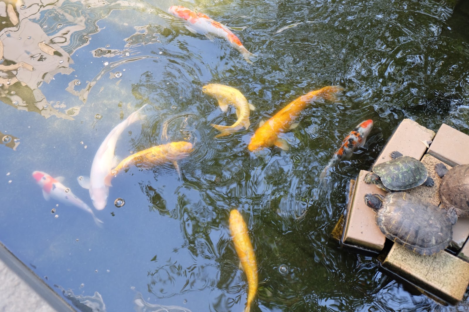 在露天位設有水池,除了慣常見到的錦鯉外,更有十幾隻巴西龜,扒在磚頭疊起的平台上,懶洋洋的在曬太陽,真夠閒情逸致