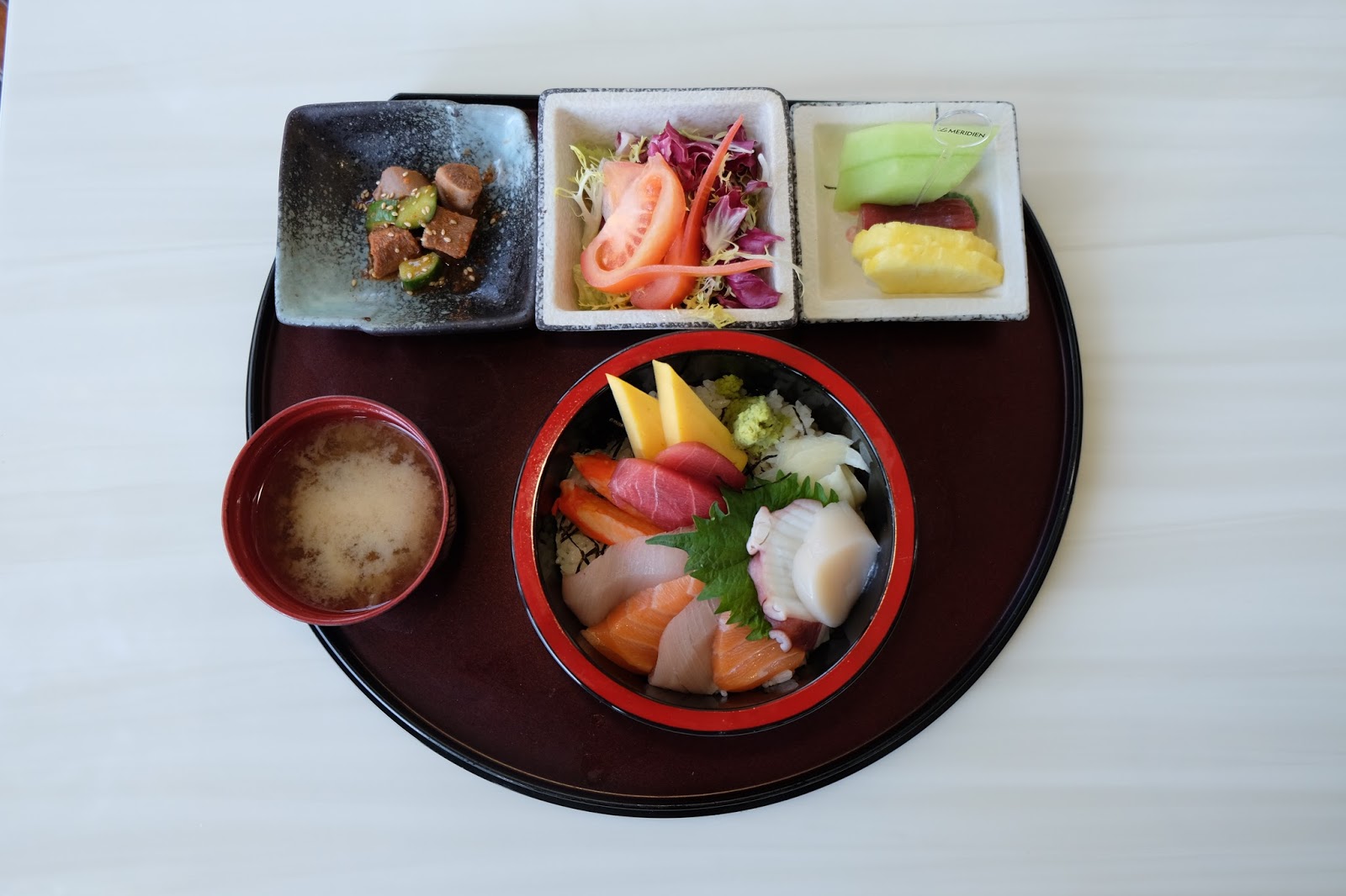 主食是在飯面上蓋滿了帶子、三文魚、油甘魚、吞拿魚、玉子、八爪魚與及蟹柳,種類繁多,同行的女性朋友都吃不完,就由在下代勞清碗好了!