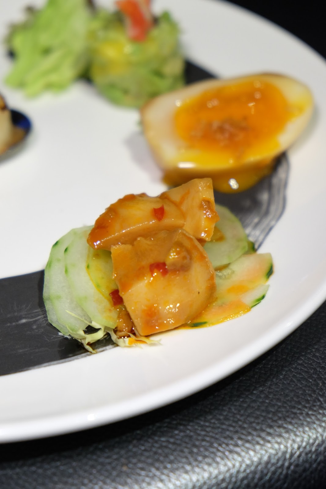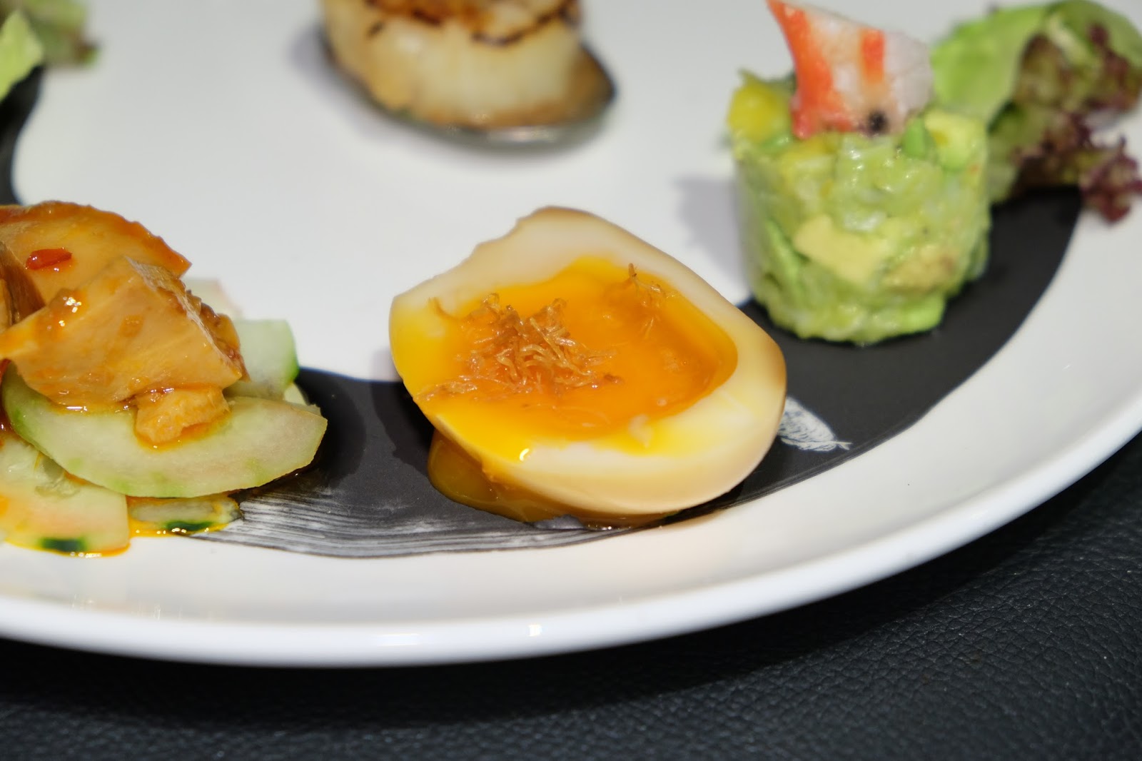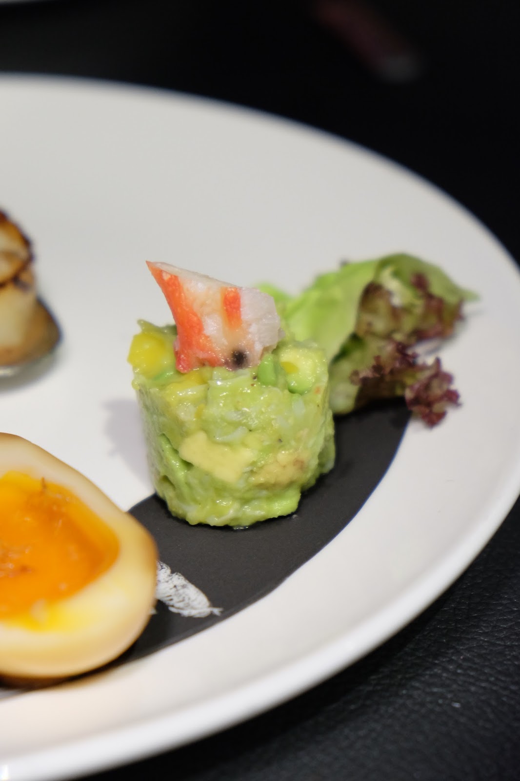 牛油果阿拉斯加長腳蟹沙律、燒汁日本帶子、果木煙燻鴨蛋及麻辣澳洲鮑角