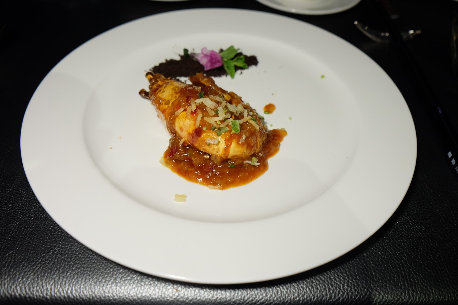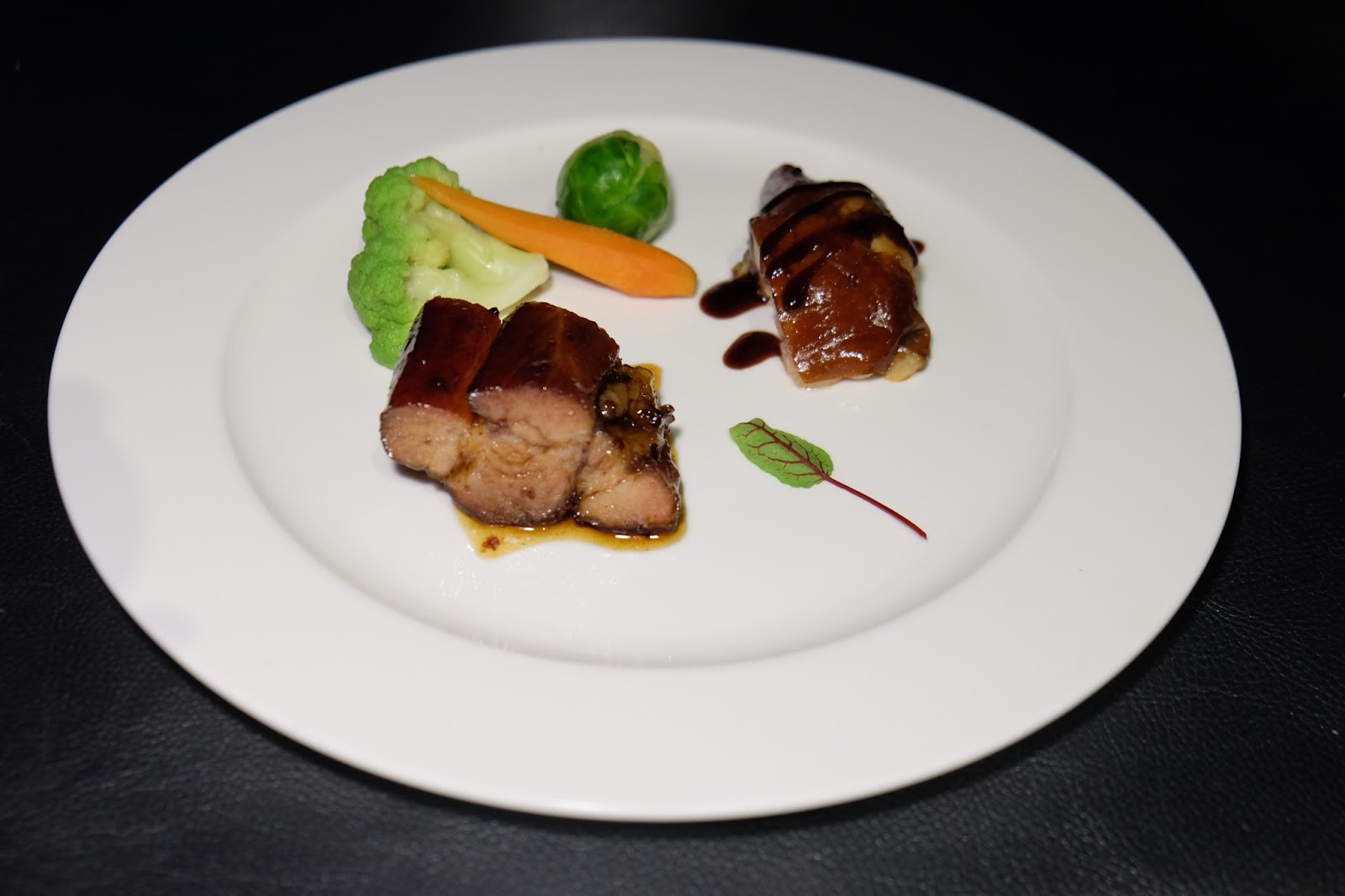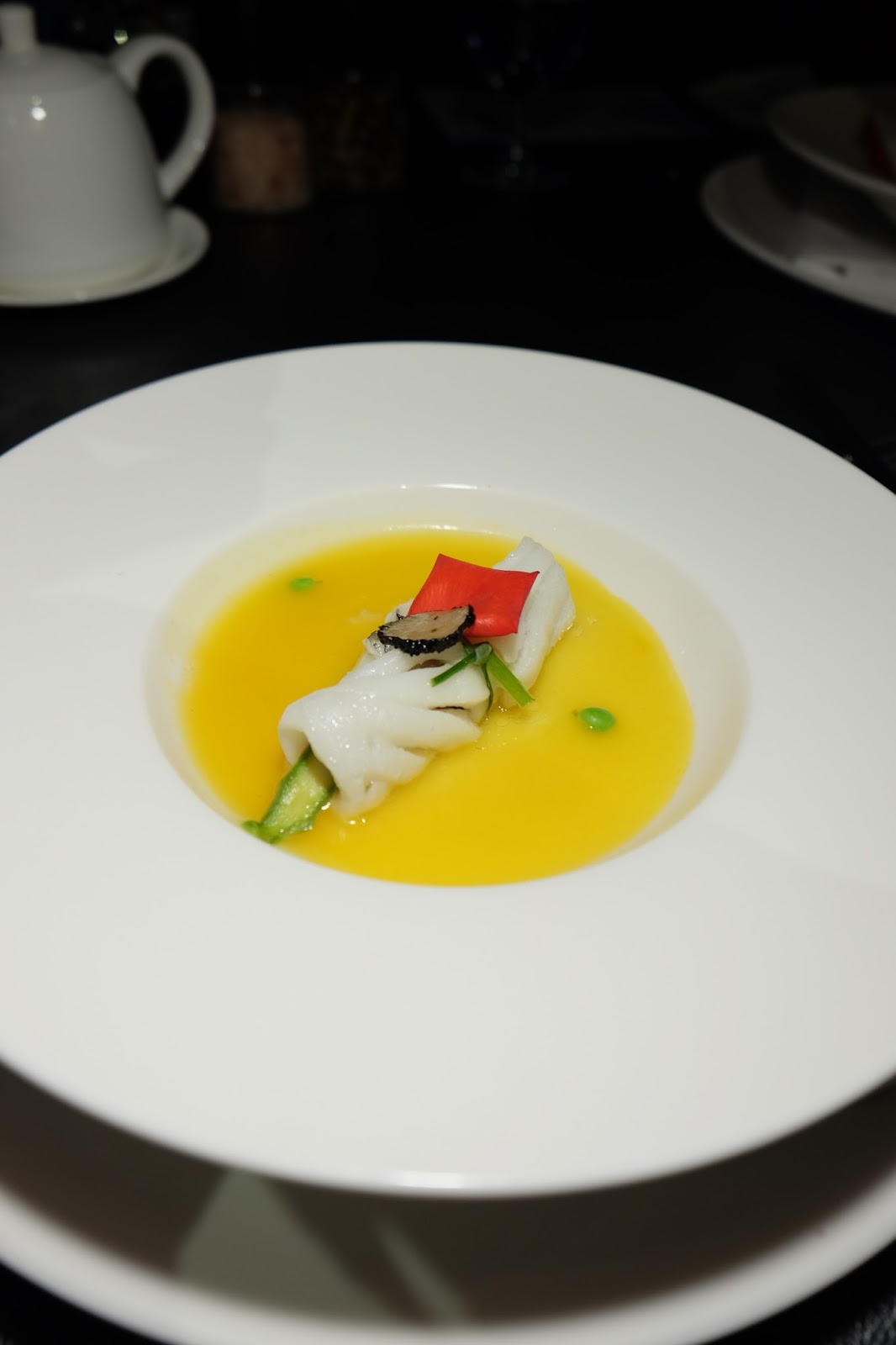 幾個菜色,太太最喜歡的一款,墊底的蛋白嫩滑,蓋上薄紗一層的南瓜汁更添味美,鱸魚肉卷中間夾有金華火腿及蘆筍片,帶來了一陣咸香,再放上一小片松露,傳來淡淡的幽香,整體配搭完美。
