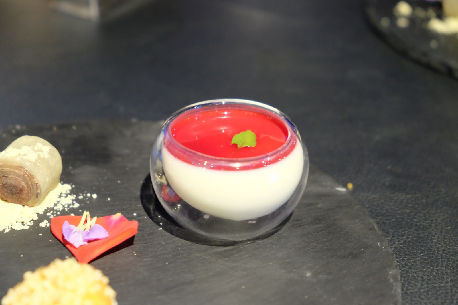 三式甜品是流沙金球、驢打滾、紅桑子奶凍。