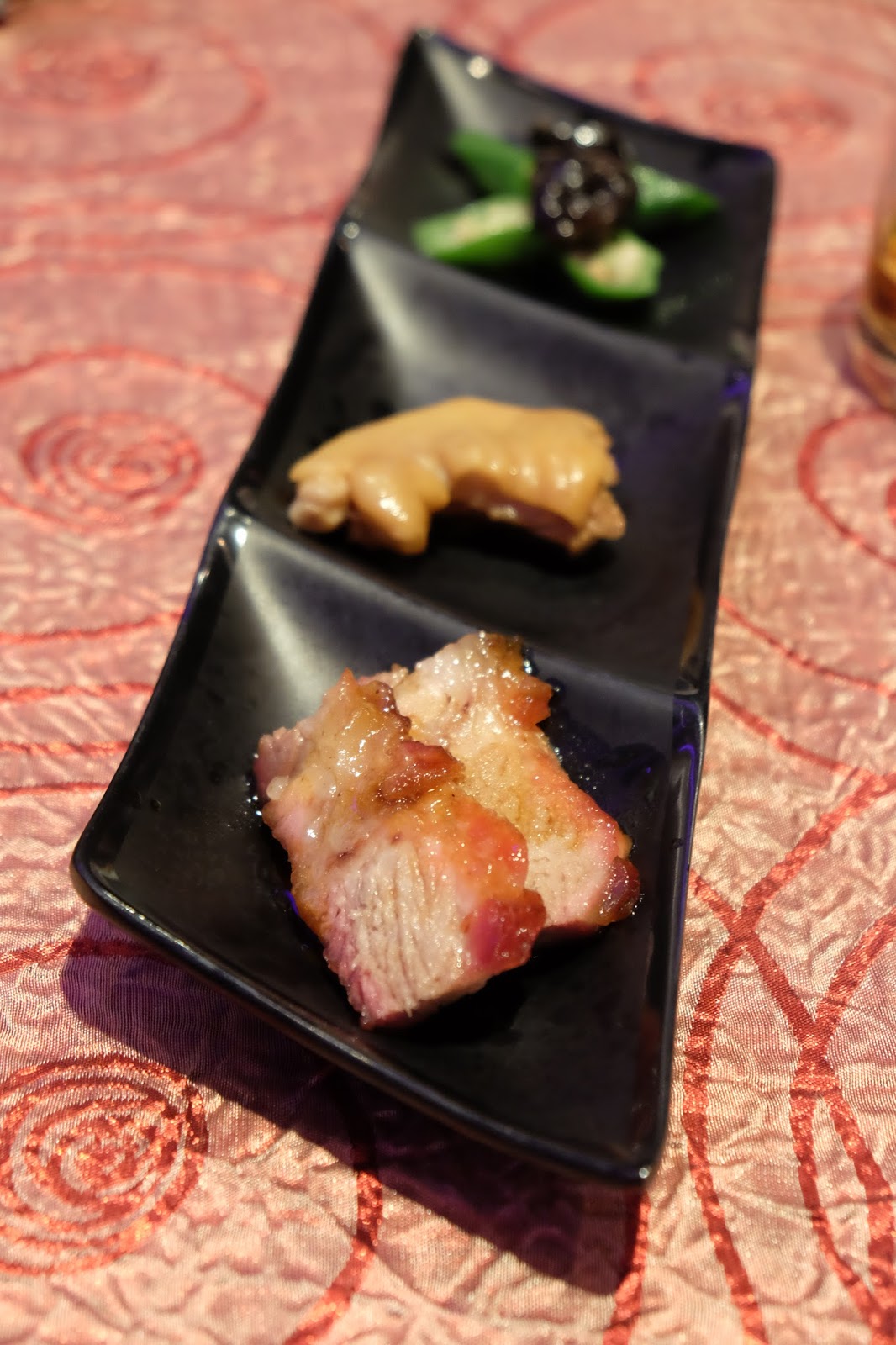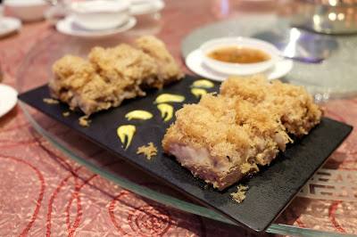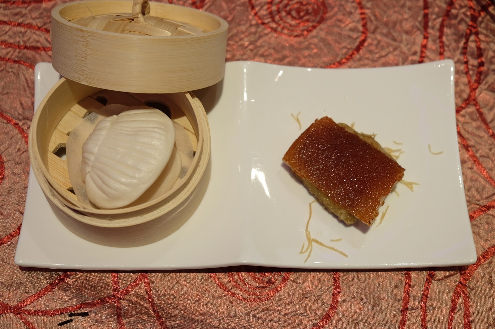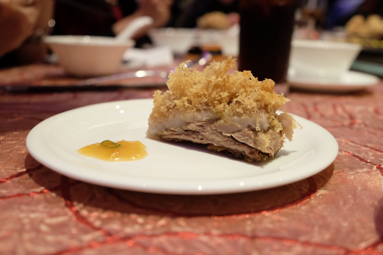 預先已砌好,乳豬是酒店自家出品,芝麻皮香脆,水準有保證,夾上入口即化的鵝肝,份量恰好,令人只覺口感豐腴而不覺膩,連同蝴蝶夾一齊食,好幾種口感在口中迸發,真的要好好享受。