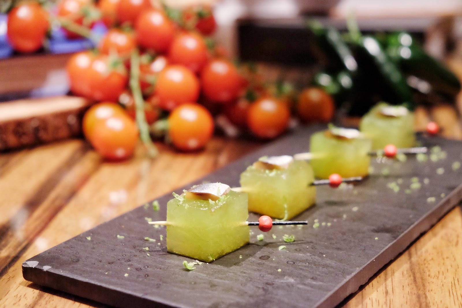 緊接而來的另一道菜,是更吸引,丁方的蜜瓜粒以雞尾酒 Caipirinha 泡浸12小時,然後放上醃漬過的鯷魚及檸檬皮,平衡了氣味,清新中夾雜了咸香,層次分明。