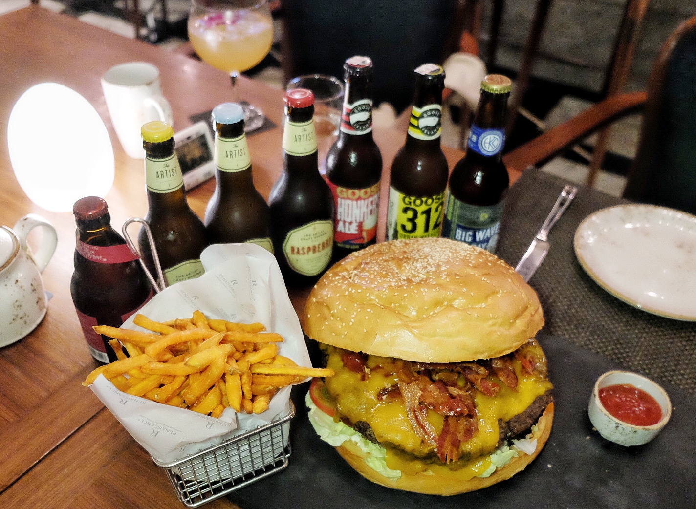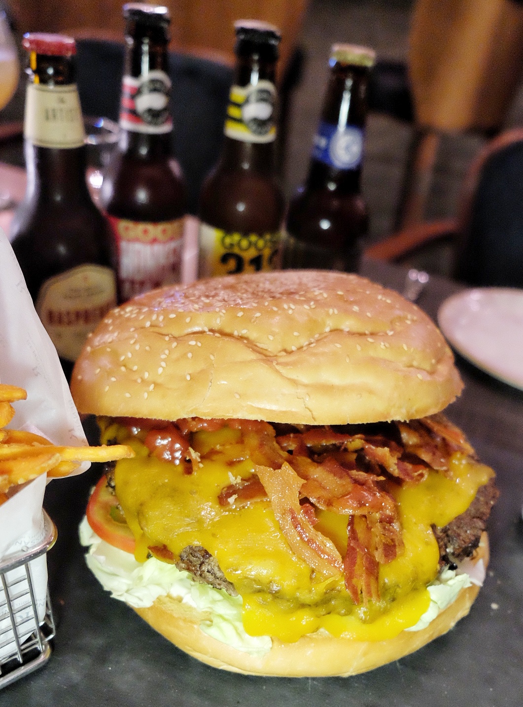 講返今次挑戰,早前已經有幾位實力食友出戰,但都鍛羽而歸,於是決定拉埋另一位千杯不醉食友E,7枝啤酒連蕃薯條交由食友應付,而自己就決戰巨型狂牛漢堡。