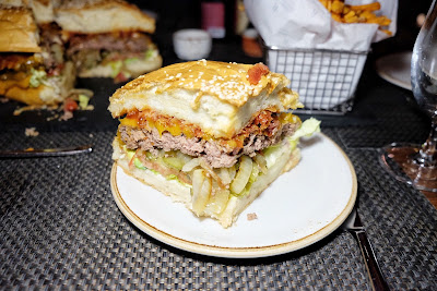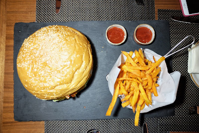 準備時間大概20分鐘,當整個套餐放上檯時,兩位麻甩已經即時滴汗,因為單是牛肉已達重量級的800克,上下兩層麵包已經等如一磅白麵包,還未計煙肉、洋蔥、酸瓜、蕃茄及生菜,誇張到一個點。