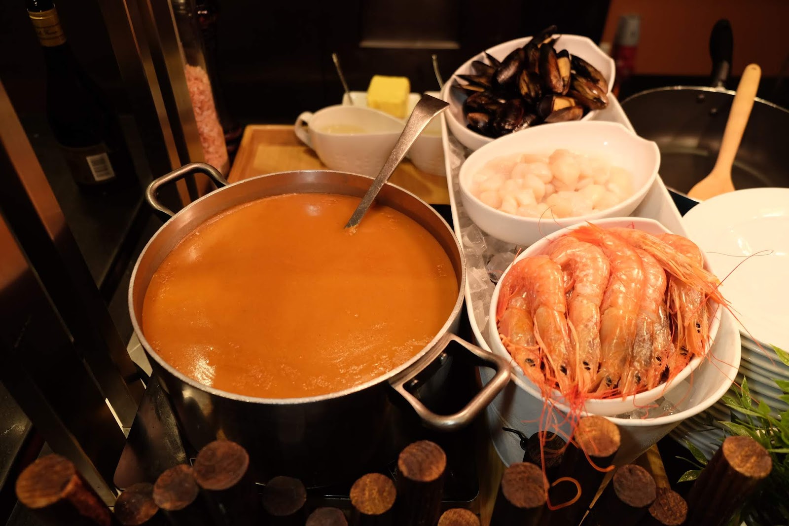 每一碗都是即煮,充滿誠意度,先將赤蝦同藍貝用蒜粒爆香,再加入牛油及白酒煮,即時香氣四溢,最後澆上預先煮好的龍蝦湯,與及加入帶子粒,配料十足又鮮甜,千萬不要錯過。