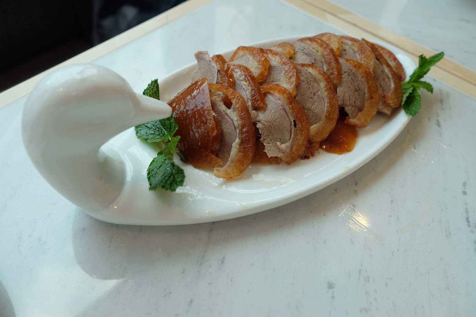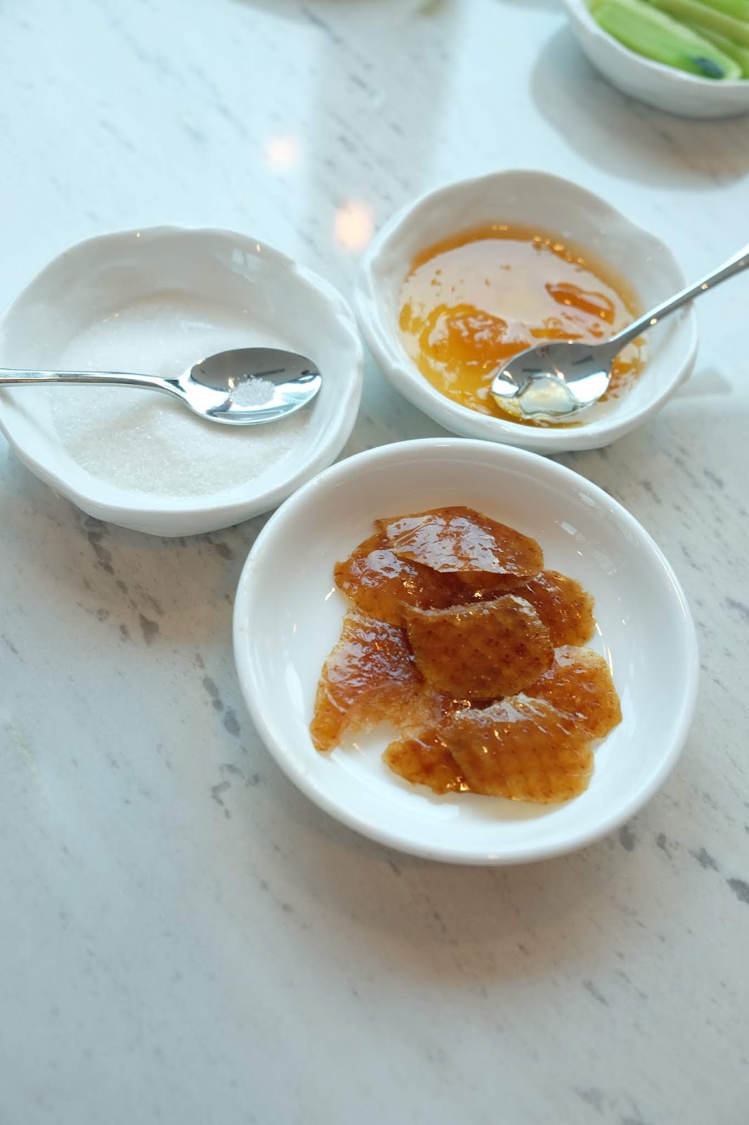 店方名物,原隻即烤上都是$340左右,在老尖區是相當相宜的,大廚將胸口鴨皮片喚作「一口酥」,蘸點砂糖食更酥香甜美,其他部位片成兩碟,加上哈蜜瓜條、青瓜條、京蔥絲及甜醬,再加薄餅皮包裹,滿咀油香,難怪就算是中午,每張大檯都點上一隻。