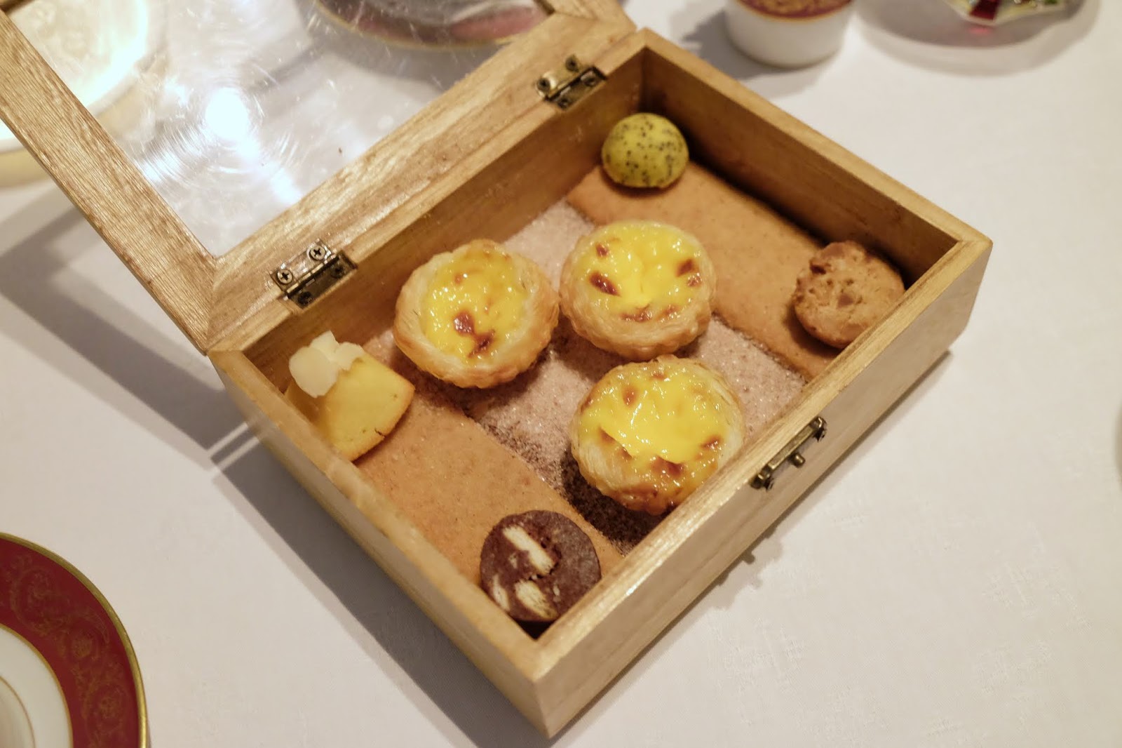 壓軸的 Petit Four 以小木盒奉上,份外覺得高貴;除了四式小點外,更有名物迷你葡撻,外層酥化,內裡香甜幼滑,又是高水準示範作。