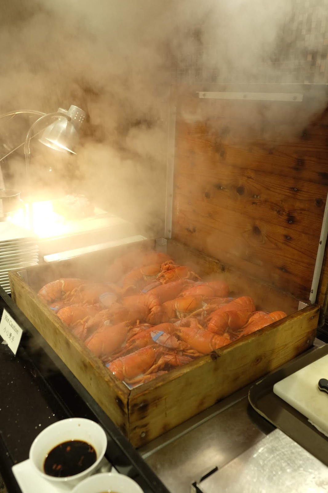 用先前蒸海鮮大木盤蒸龍蝦,每位半隻,肉質當然比起凍食來得細緻彈牙,簡單的下點醬油來提鮮,已經好味到不得了