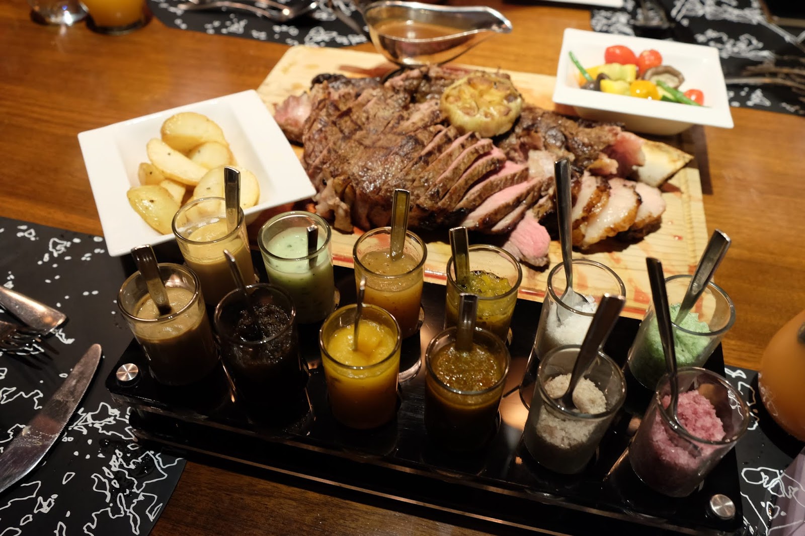 超大份,夠3至4個人分享,烤得略嫌過了火,但有8款不同Sauce及鹽供蘸點,都幾特別,最喜歡近骨位的肉,多了一份油香,又有嚼口,配返杯紅酒一流。