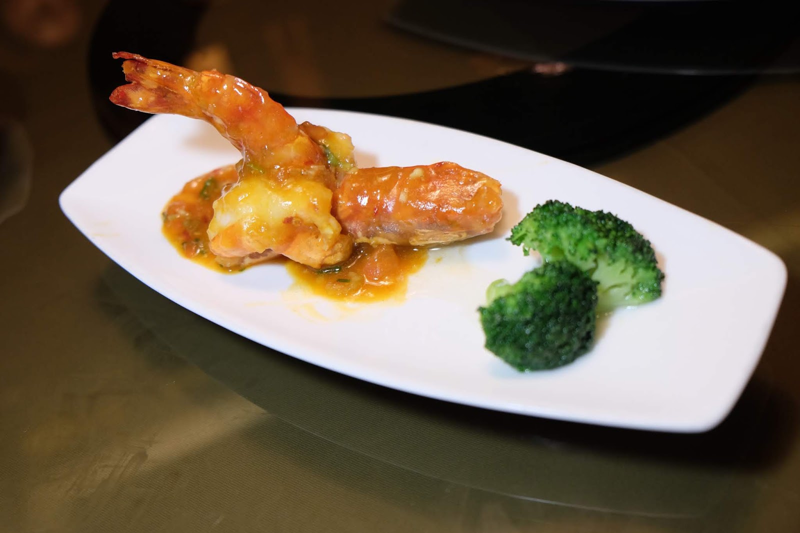 原隻泰國大虎蝦,褪去中間的蝦殼,剖開中間,穿成盤龍的外型,泡油後再澆上燒汁,不單香口,而且好入味,肉質爽彈,好味。