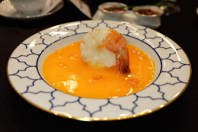 原隻大海蝦褪殼後,剔走腸臟,頗見用心,墊底是軟滑的豆腐,再用蟹膏埋了薄芡,雪白與艷虹的色彩相映襯,效果不錯。