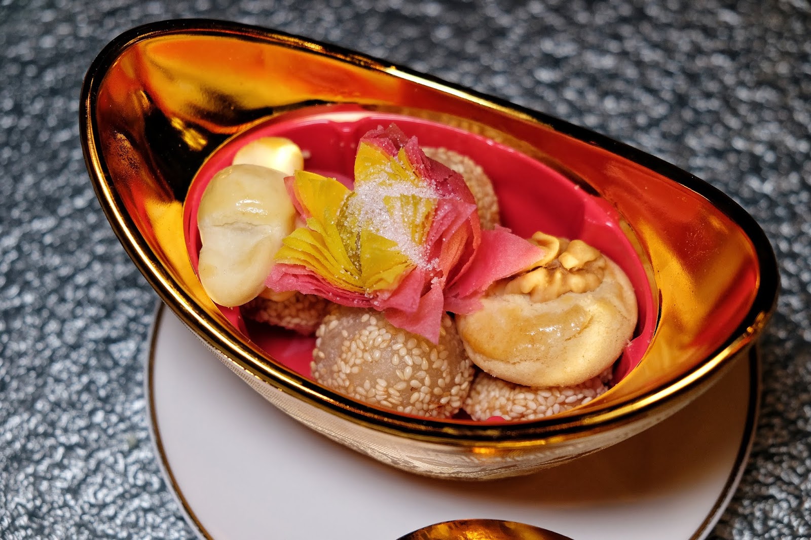 擺放落金元寶,象徵財源滾滾,合桃酥更搓揉成迷你元寶,好得意啊!加上開心笑口棗、亮麗牡丹酥及香脆煎堆仔,的確是新年菜中的重要角色。
