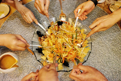 近年興起的賀年菜色之一,意頭極好,材料配搭千變萬化,不外乎是脆脆片、三文魚、薑絲、蜜瓜絲、甘筍絲之類,務求色彩絢麗,意頭要夠好,味道反成次要,畢竟是酒店中菜廳,加入鮑魚絲,食落更覺矜貴。