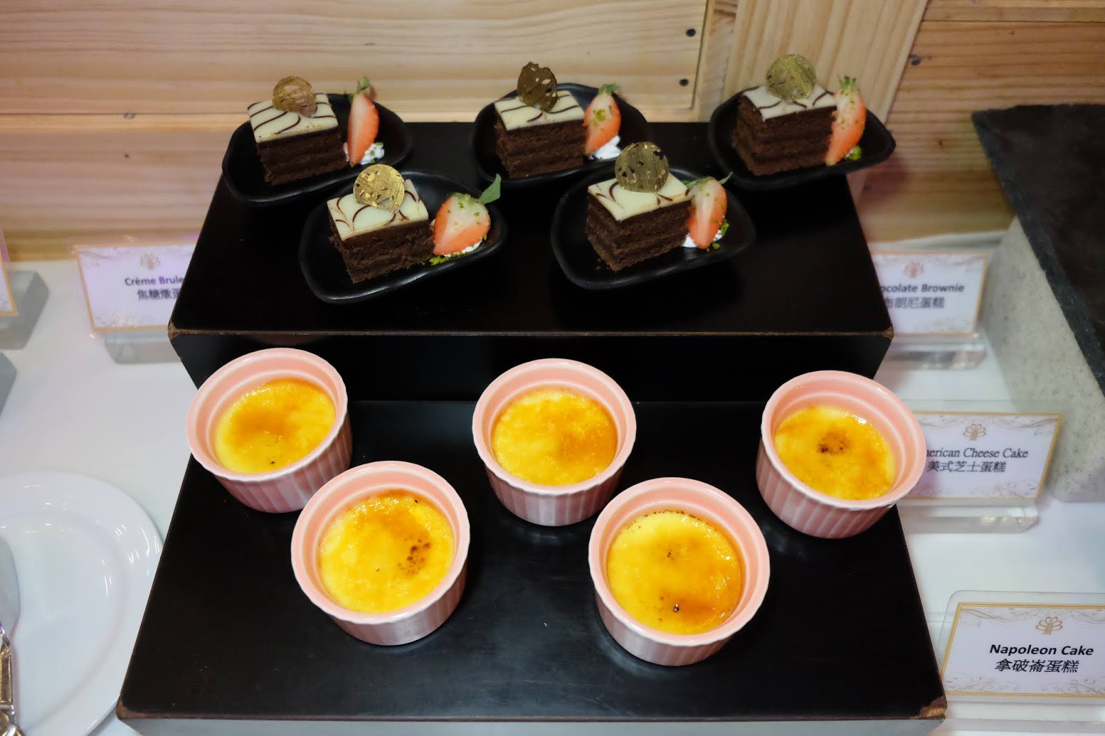 甜品陣容都不俗,有杏仁榛子蛋糕、白酒啤梨啫喱、冧酒軟朱古力蛋糕、黑芝麻芝士蛋糕、Tiramisu、白蘭地黑朱古力蛋糕、櫻桃白森林蛋糕、芒果慕絲蛋糕、美式芝士蛋糕、拿破崙蛋糕、焦糖燉蛋、法式軟朱古力撻、法式栗子撻、馬卡龍 及 Jelly