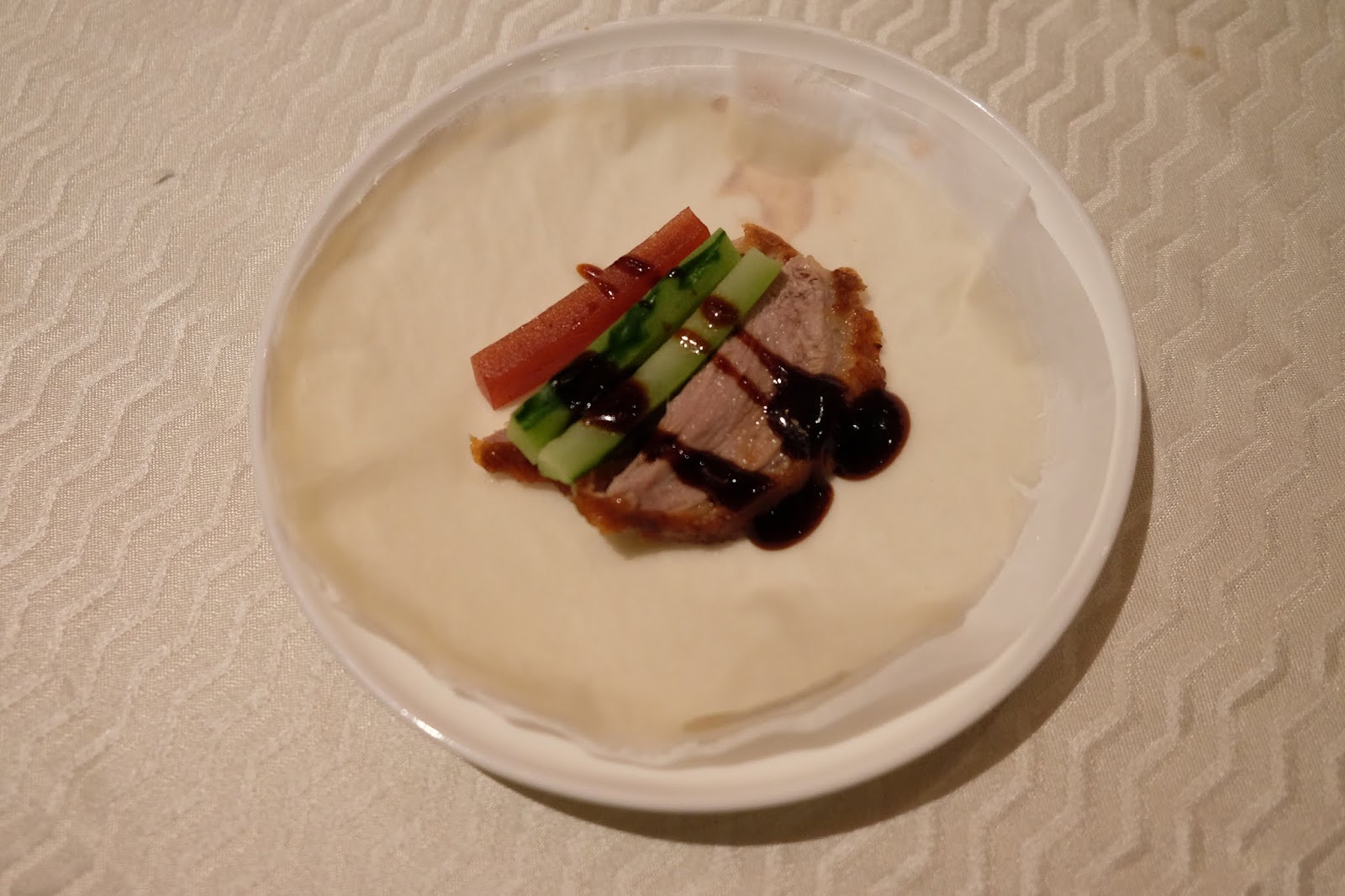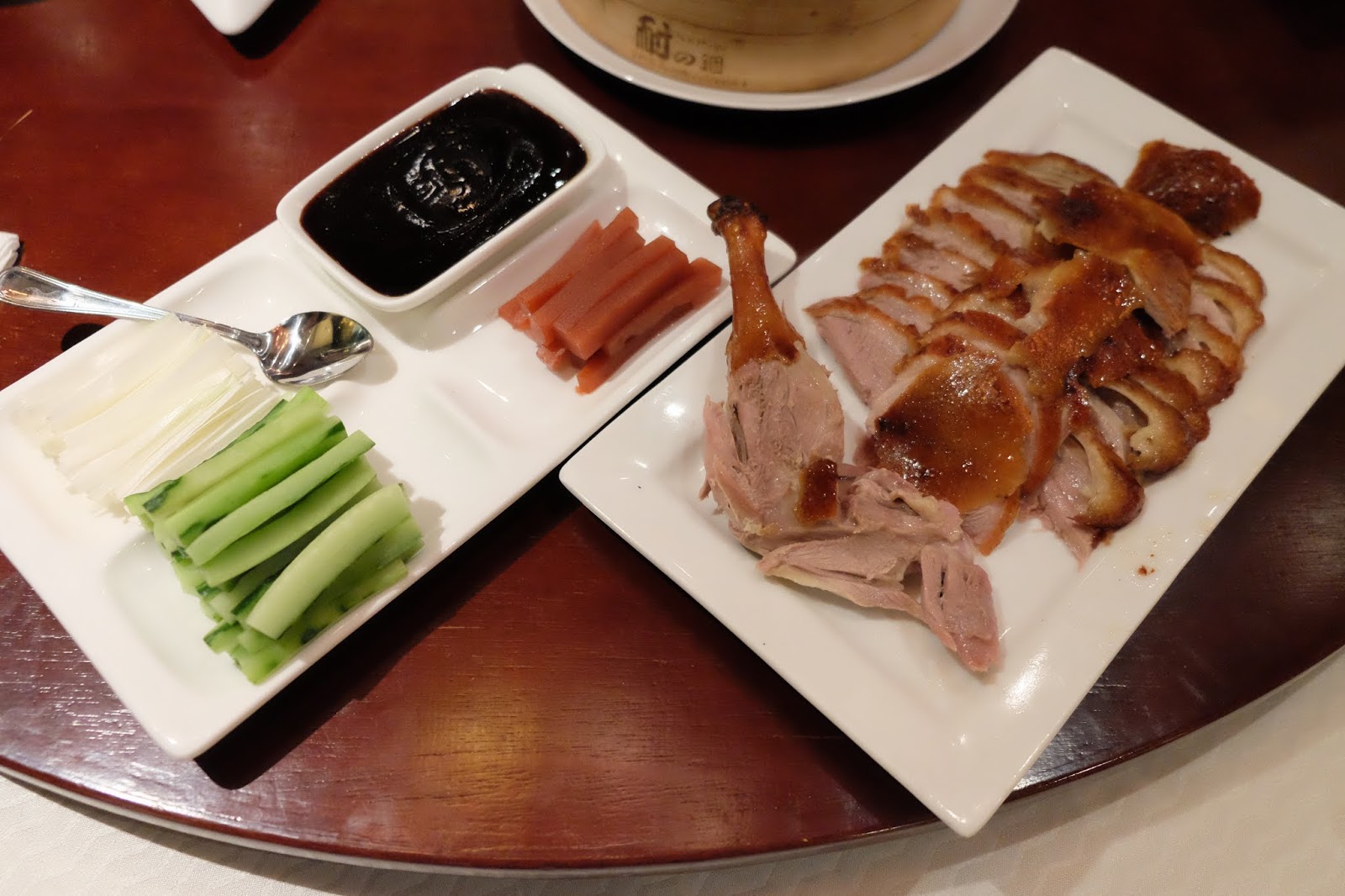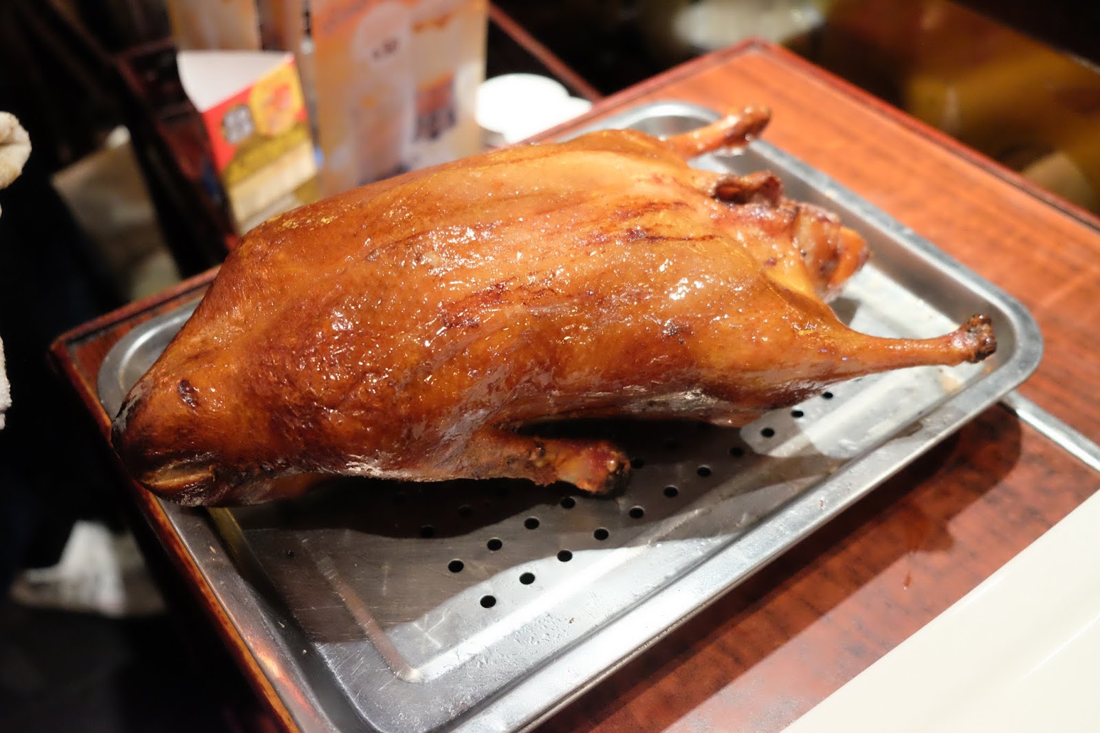 即烤即片,然後連同山楂條及京蔥,塗上甜醬,用薄餅皮包好一齊食,真是人間美味之一。