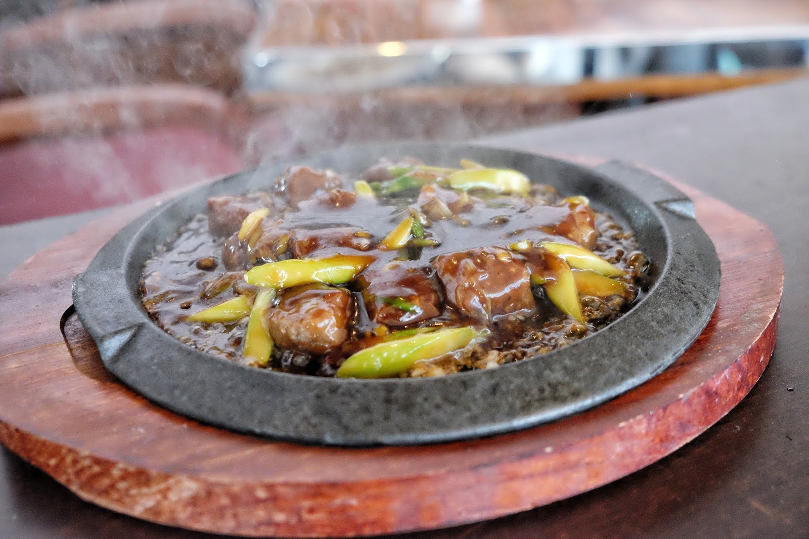 上檯前先放入蒜茸、露筍及京蔥爆香,然後放入已半熟的和牛粒,即時香氣四溢,肉質軟稔,好味。