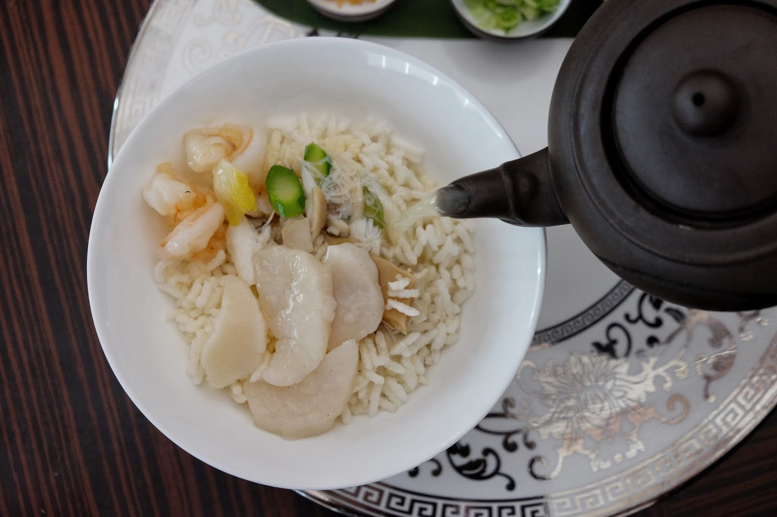 賣相亮麗,雞湯用茶壺盛放,金蒜茸、蔥花及芫荽用小杯飯粒輕輕炸過,咬落卜卜脆,但注湯後要快食,否則飯粒會變稔,配料有松茸片、帶子片及蝦仁,好幾種口感夾雜,湯底鮮甜,真心推薦。