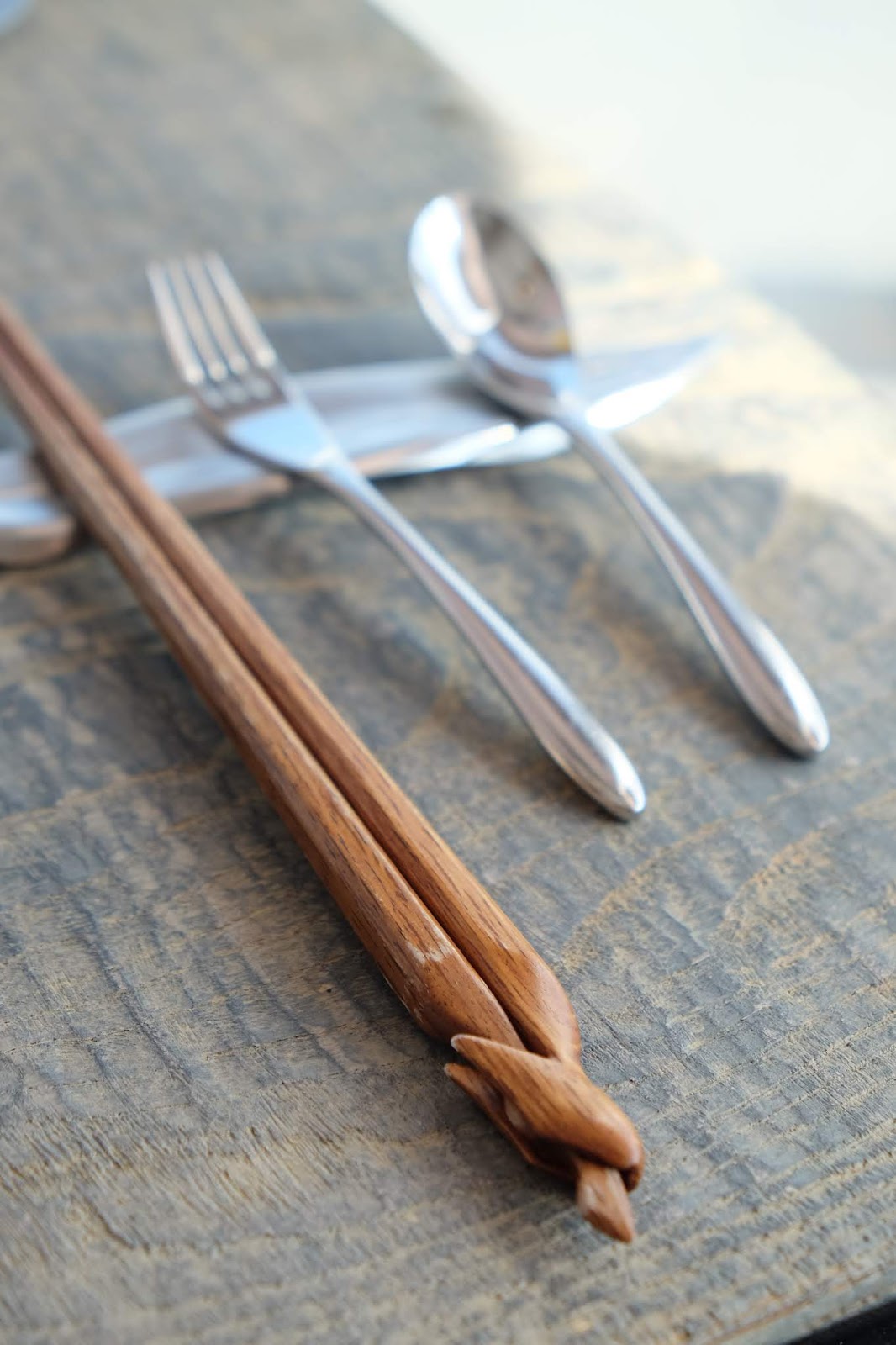 餐廳裝潢走典雅格調,實木桌子,筷子刀叉都是加上自己品牌,設計獨特。