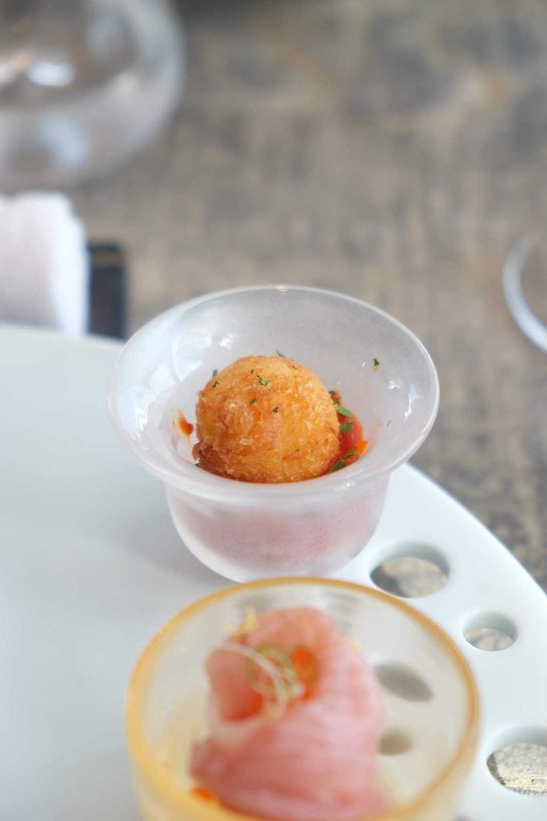 餐所謂不時不食,所以每天不同,今日是北海道毛蟹薯餅配番茄醬、鰤魚配三文魚籽及椰子青豆泡沫配牛肉清湯啫喱。