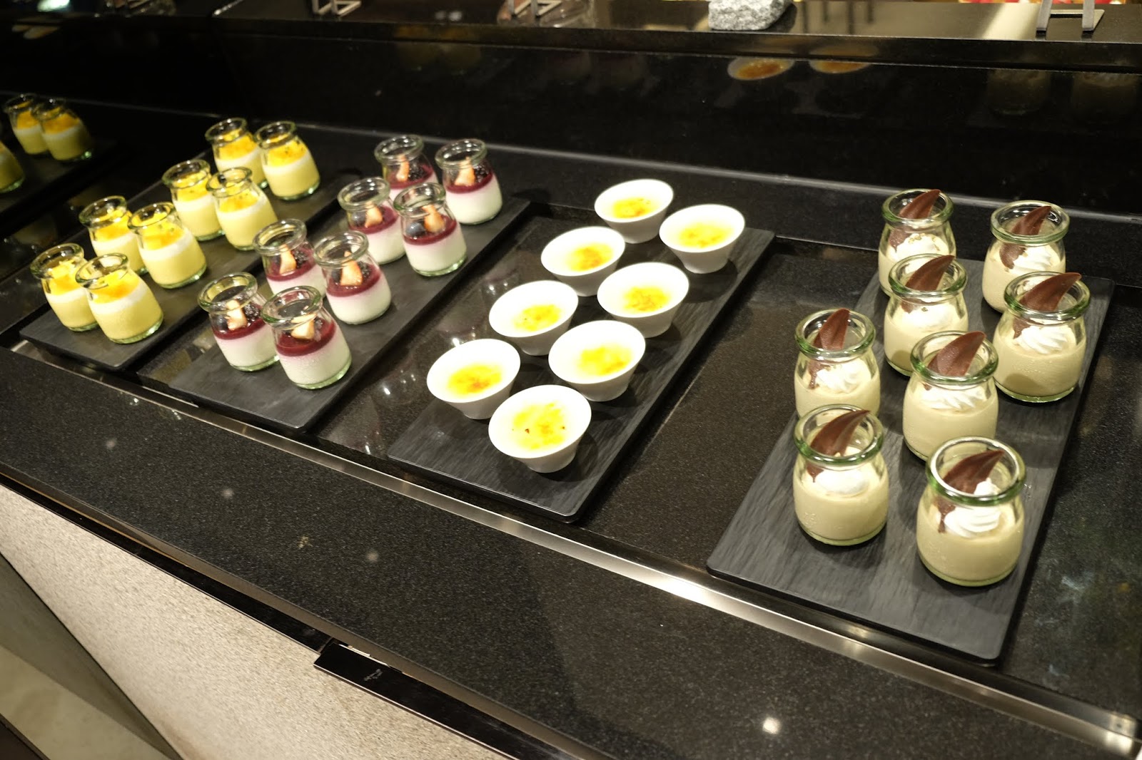果仁糖牛奶朱古力慕絲蛋糕、焦糖白朱古力布甸、焦糖布甸、藍莓panna cotta 及 芒果布甸。