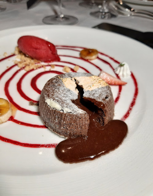 暖朱古力流心蛋糕加上金箔,望落加倍名貴,切開一角,朱古力漿徐徐流出,相當對辨,吃一口暖朱古力,再伴一口冰冷的紅桑子雪糕,熱情與冷靜,交織出美好的畫面。