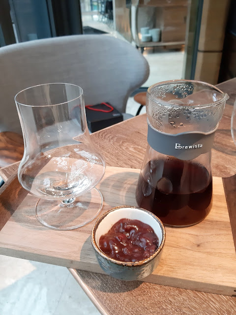 香味濃郁,有種煙燻的香氣,呷一口,酸度中等,圓潤幼滑,真的不錯,其實,仲有一種品嚐方法,就是在咖啡中加入十勝紅豆茸。