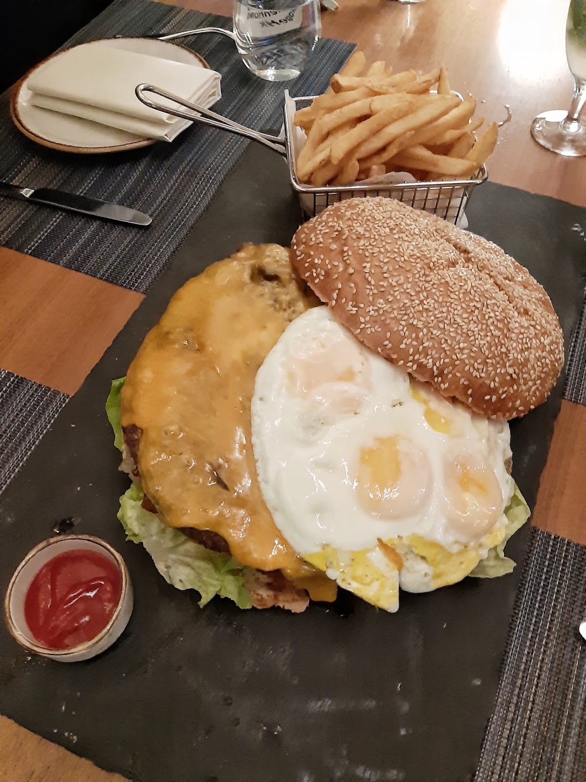 拎起面層漢堡包,先係四隻雞蛋煎成一大塊,之後係三至四分厚既漢堡扒,墊底是cheddar cheese、12塊香脆煙肉、醃青瓜、蕃茄片及生菜,加上漢堡包底,仲要有一底熱辣辣啱啱炸好既薯條,想食晒?完全是人體極限。