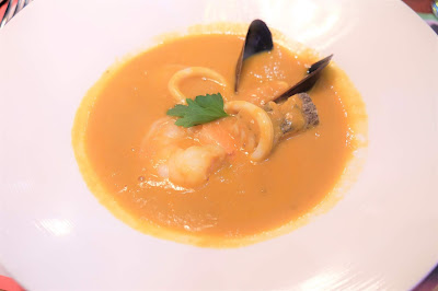 材料豐富,有帶子、藍貝、魷魚、海蝦及鱈魚柳,而湯底濃稠,每口都有幽香的蕃茄及蝦味,有水準。