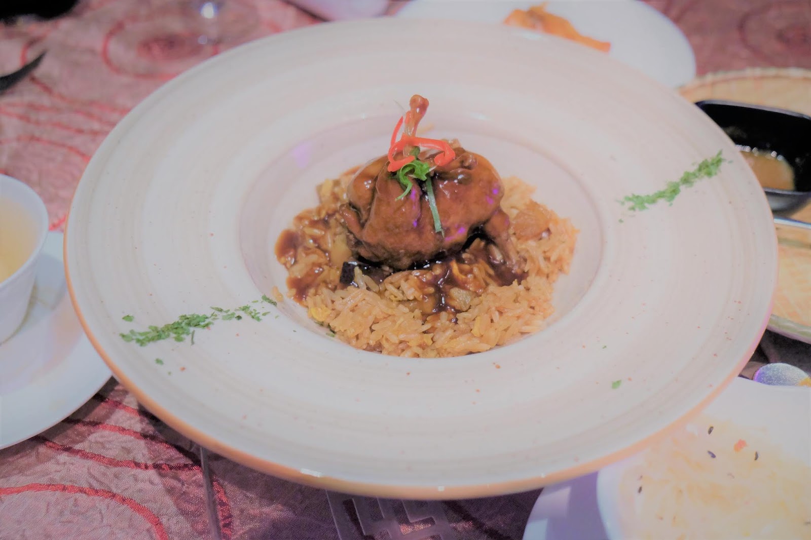 相信是整晚最誘人的菜色,體形細少的鵪鶉,竟然釀入了蓮子、冬菇及鹹蛋,仲要褪埋骨,保證啖啖肉,而置底的絲苗,加入了佛跳牆材料,真的好豐富。