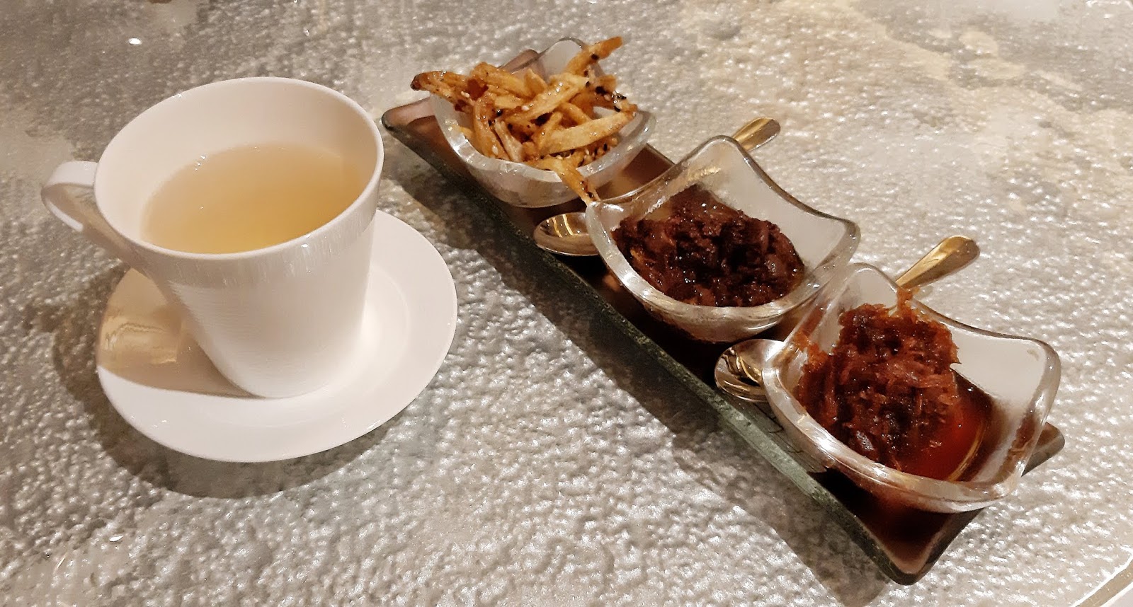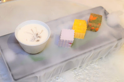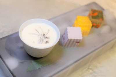 賣相一絕,以乾冰營造出仙氣繚繞的效果,四款甜品各自色彩不同,甜味各異,豆腐芝麻布甸,看似平凡,但芳香馥郁,簡單而見功夫;燕晶凝矜貴典雅;菊花杞子清新怡人;香芋水晶糕滑溜甜美,真是各有千秋,併起來卻是同樣精彩。