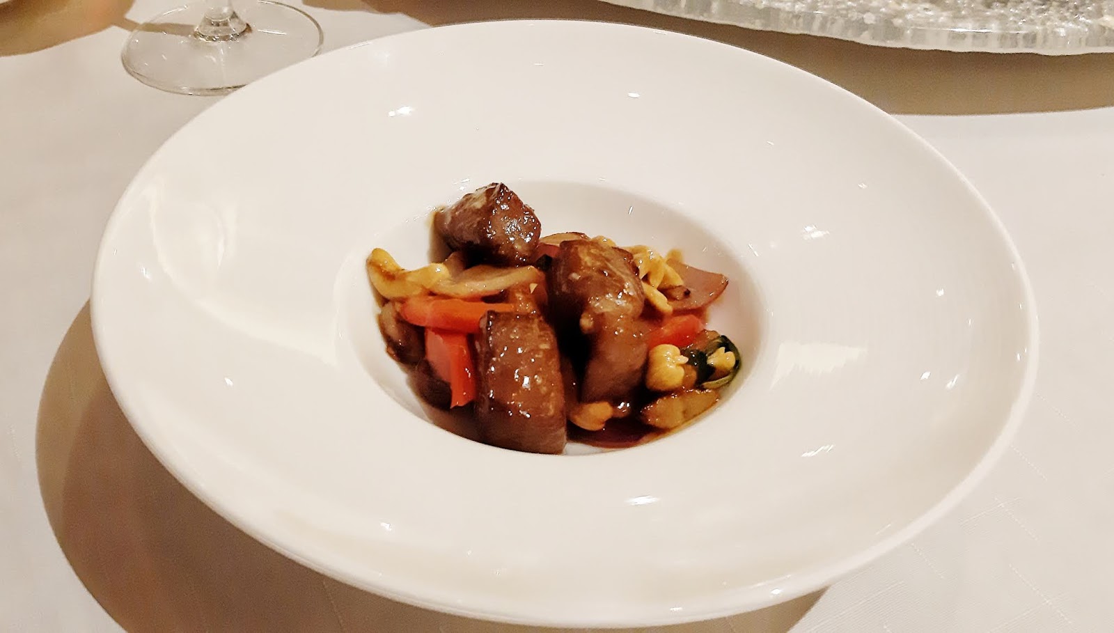 Cubed M9 Wagyu Beef, Foie Gras, Basil, Cashew Nut. Sautéed