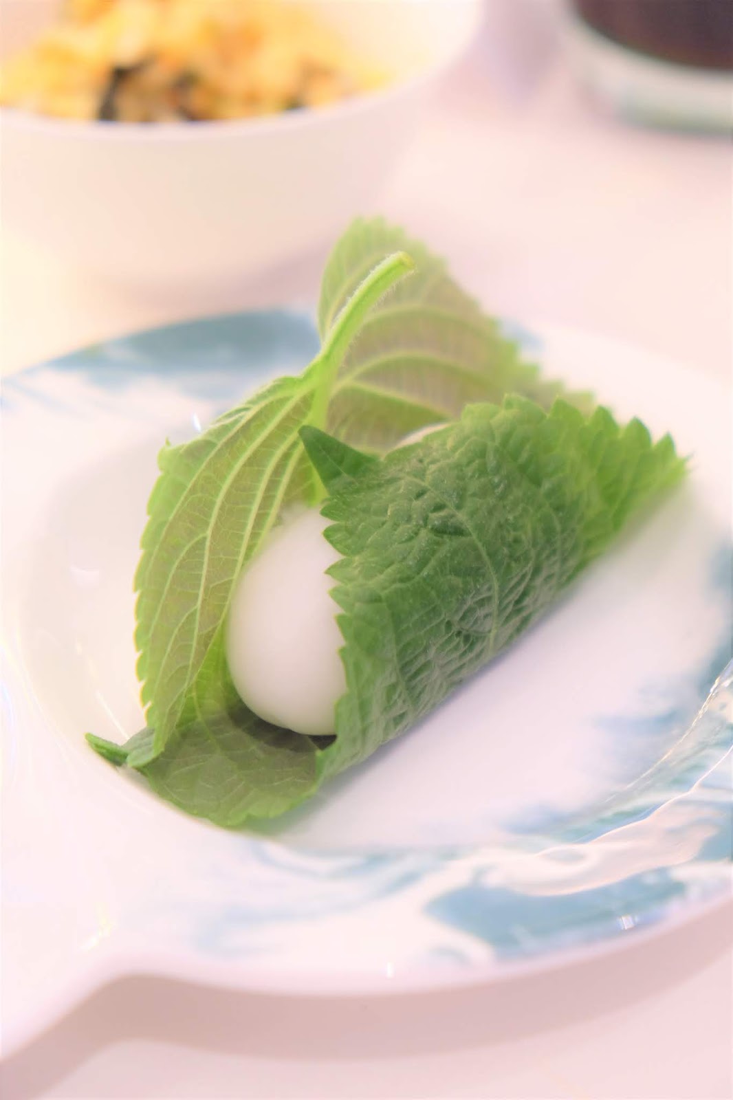 南瓜甜湯滑溜得出奇,加入南瓜籽,味道更歸一;紅豆粿用紫蘇葉包裹,咬落外層清新,內裡煙韌又甜香,非常出色。