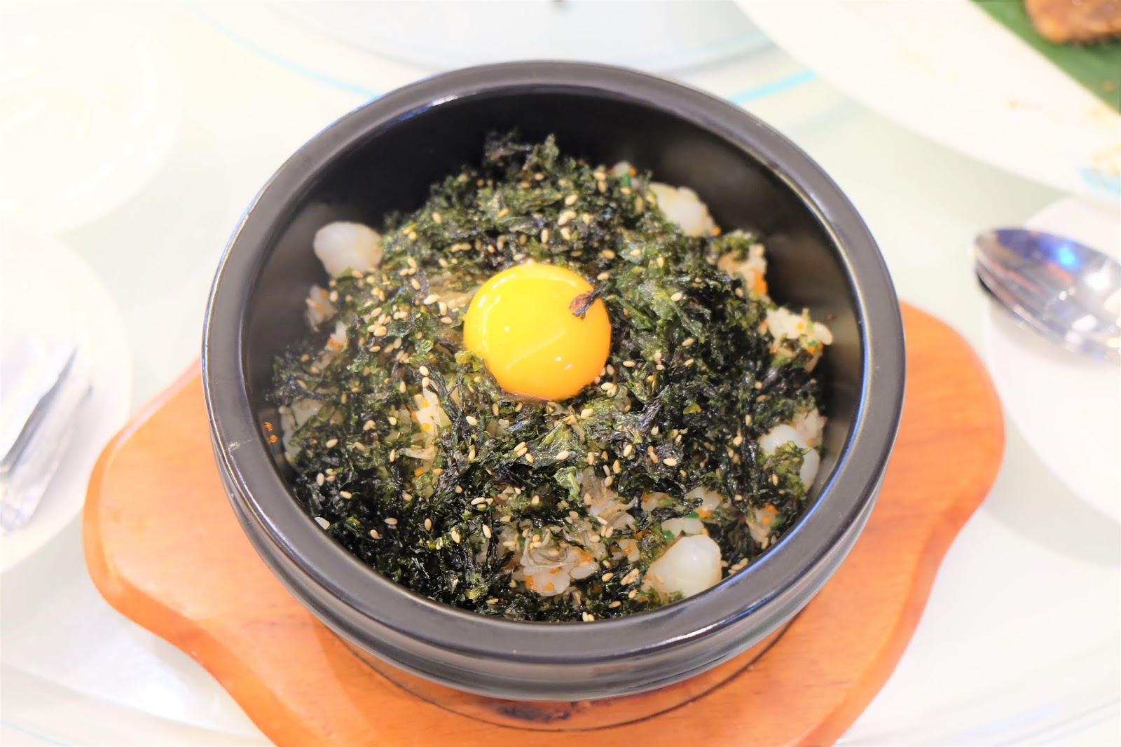 Rice, crab roe, diced shrimp, seaweed, egg yolk