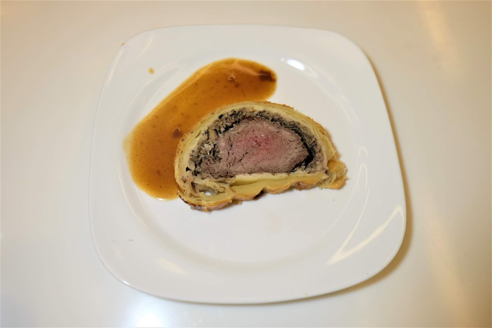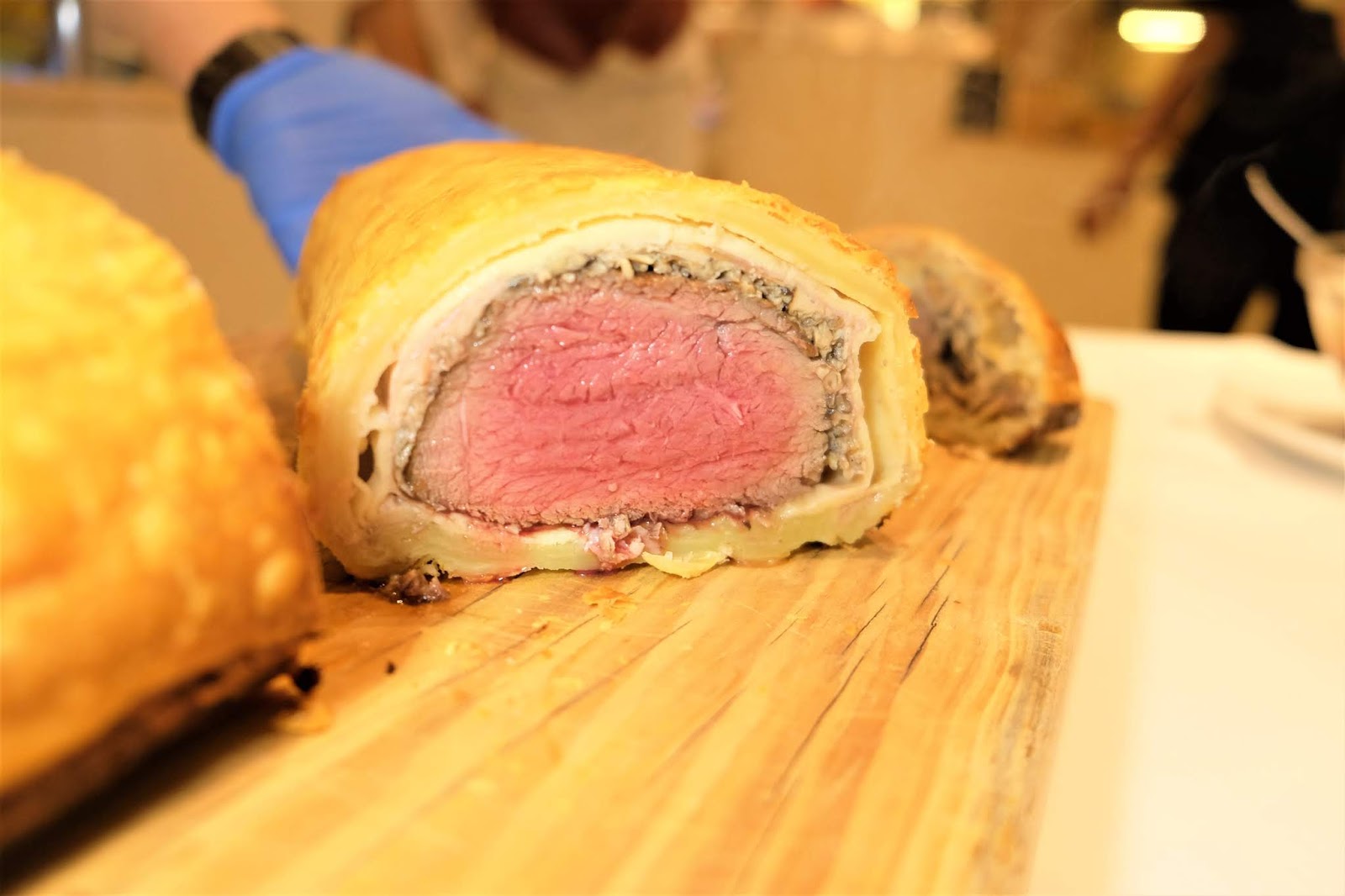先係威靈頓牛柳,可能排得太前,所以牛肉比較熟,中間位會好好多,外層酥皮幾鬆化。