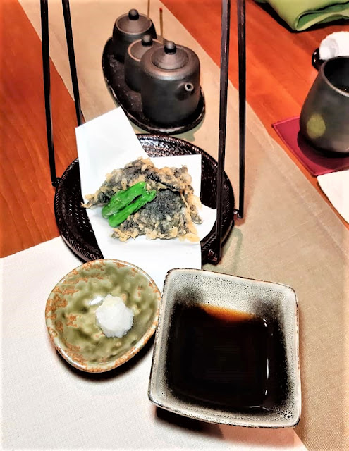 用鰹魚汁及昆布水煮好,放入紫蘇葉、海膽及柚子皮,質地滑溜輕盈,散發陣陣幽香,尤其是灑上少許柚子皮,帶來清新的味覺。