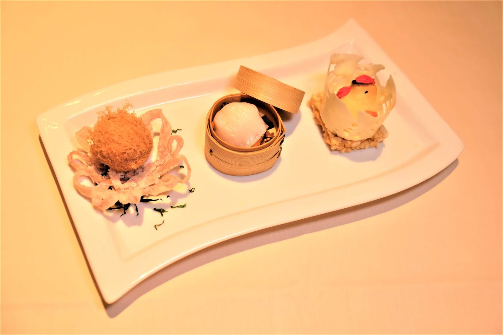 點心中,蝦餃與舊式灌湯餃一向是我的摯愛,傳統加入筍尖更添清爽的口感,餃皮搓得平均,毫無一口粉的感覺,柔韌而飽滿,通透而富彈性,褶皺能再多一點更好;芋角外層炸得酥化,但卻沒有油膩感,餡料加入芝士,味道更濃郁,好啱配返杯烏龍茶;至於金雞酥賣相好萌,放在「雀巢」上,造型好神似。
