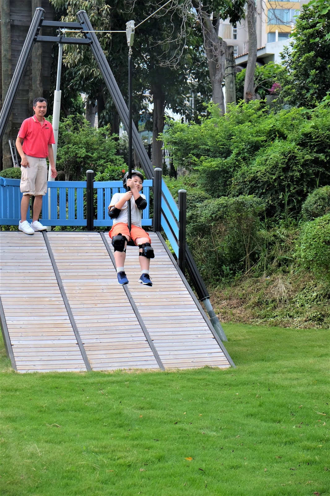 「高空滑索」的地點係酒店正門口斜對面,而且有專人指導,又有護具,非常安全,家長大可放心。