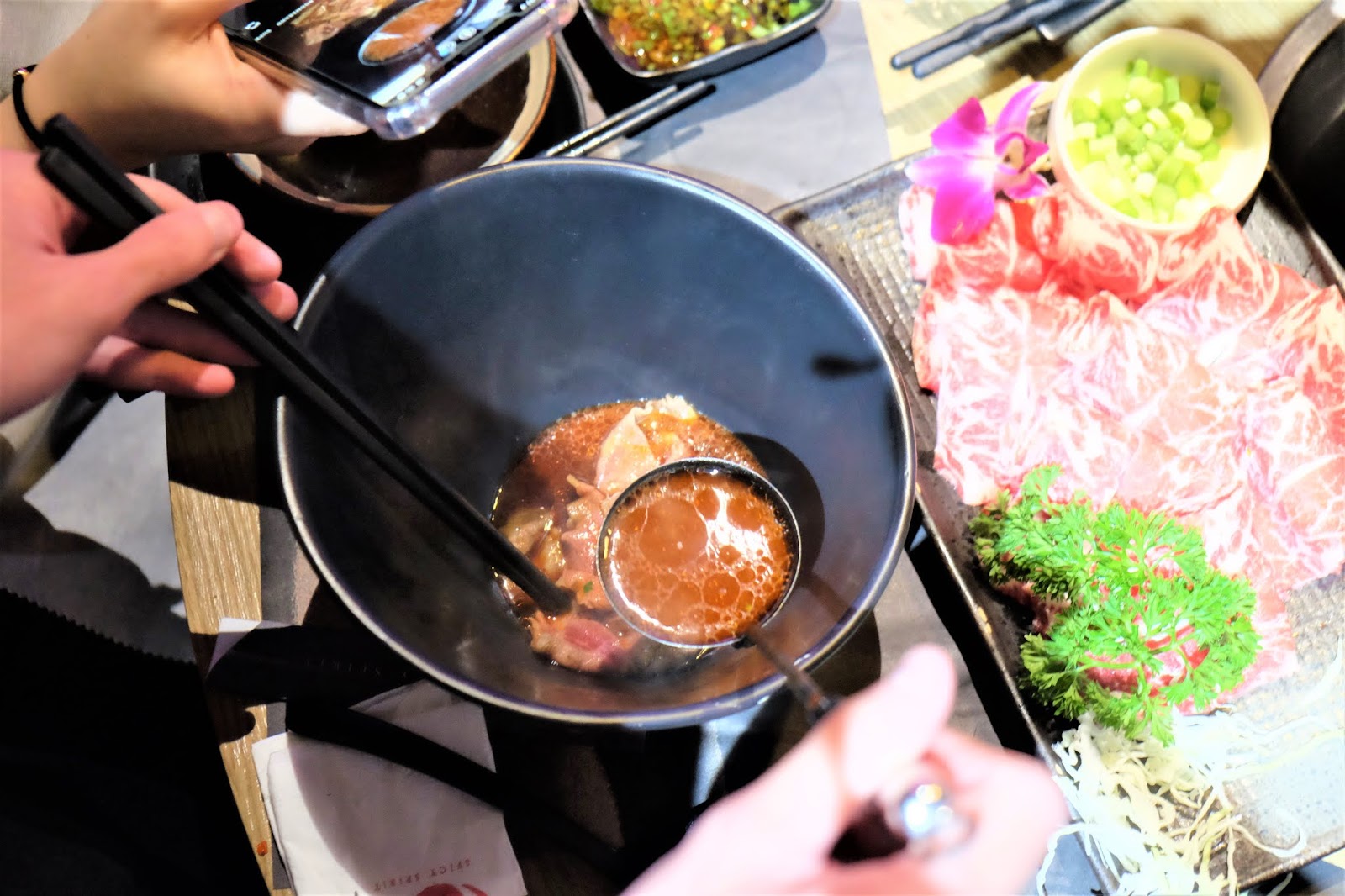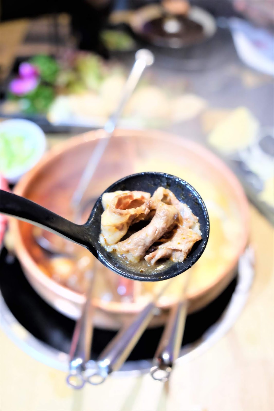 牛肉與火鍋是緊扣的情侶,牛小排是店方名物,共有三款食法,先係由店員用滾起的麻辣湯淋至7,8成熟,第二款係加入蔥粒包起一齊食,第三種係再澆上麻神特製辣油,倍添滋味。