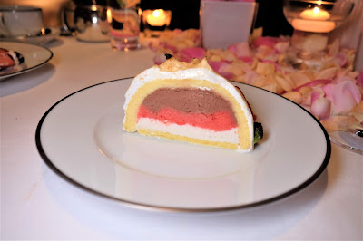 兩位用恰好,享用前先澆上烈酒再點火,賣相一流,內裡是三色雪糕,層次分明,伴碟是