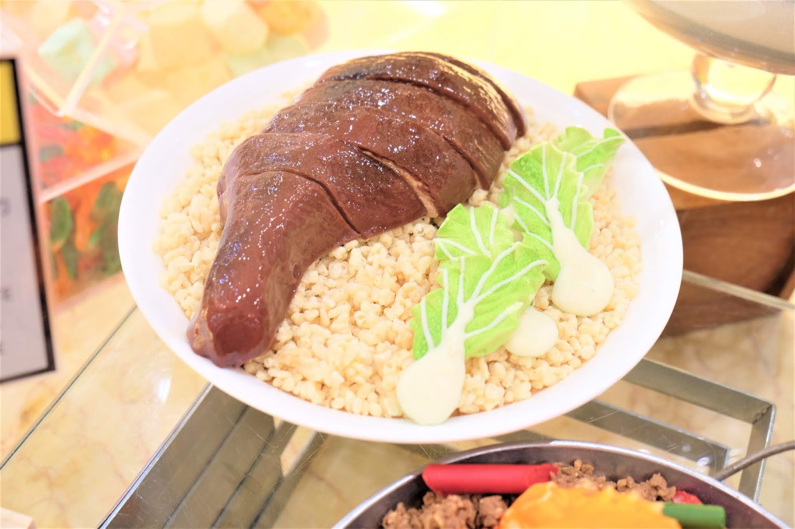 蠔牛奶布甸、鮑魚朱古力啫喱與及燒鵝髀飯(熱情果牛油朱古力香蕉慕絲蛋糕),都是像真度高,令人捨不得落刀。
