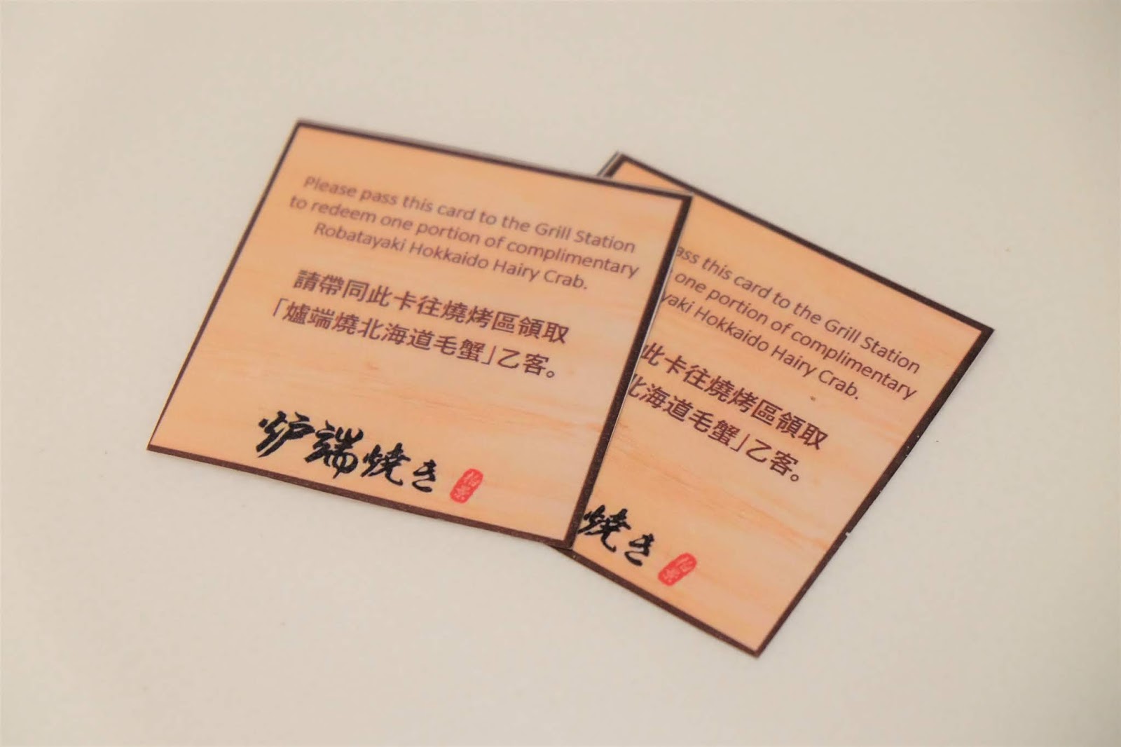 每位客人會獲發一張美食卡,憑卡可以換取一隻「爐端燒北海道毛蟹」,蟹身事先用味噌泡浸過,所以好入味,如果配杯清酒就更正。