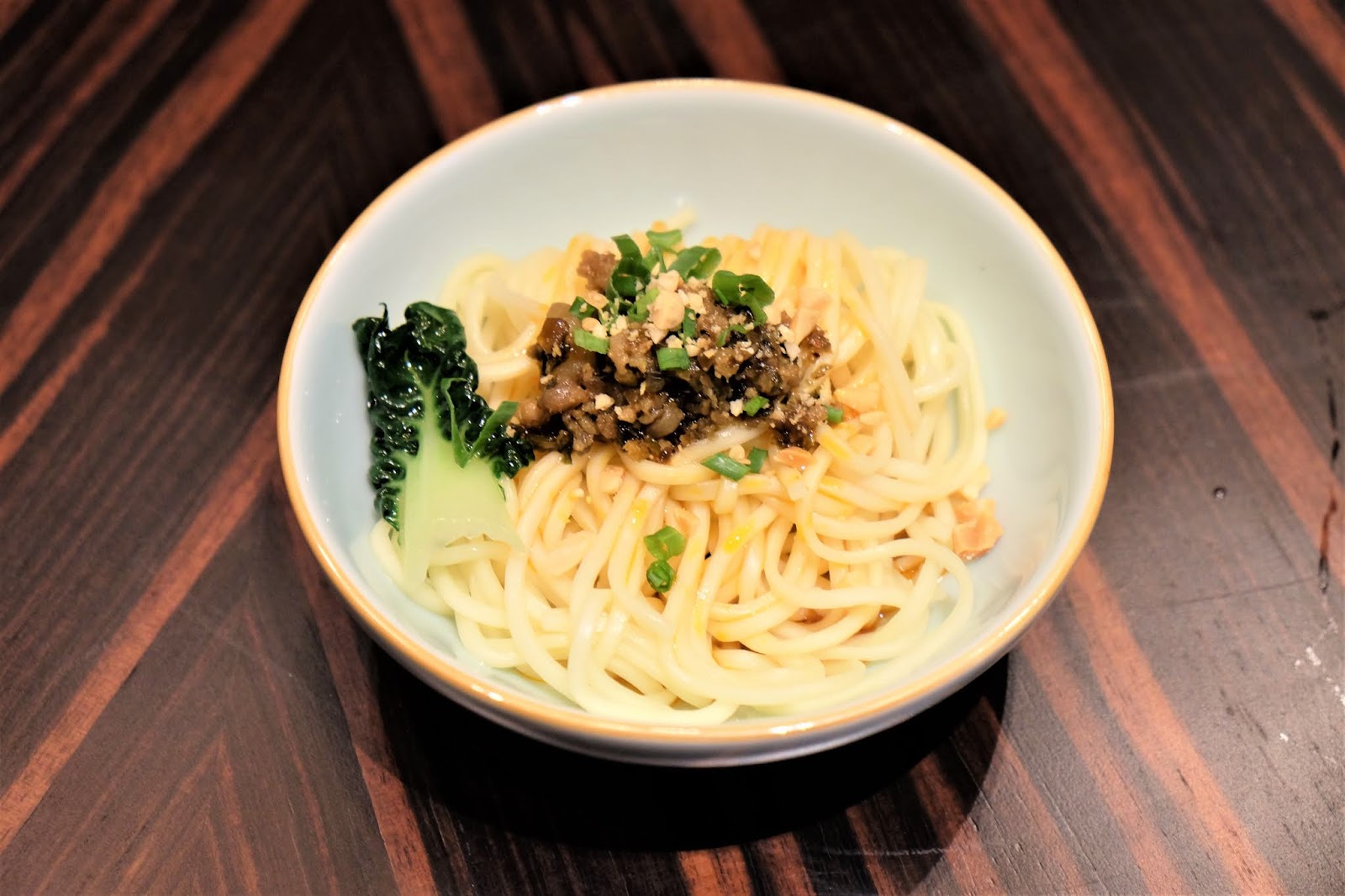 並未似香港常見的湯麵底,而是單憑肉醬與辣油的乾拌版,麵條無須在湯內泡浸,反而保持柔韌有嚼口的感覺,辣辣地幾惹味。