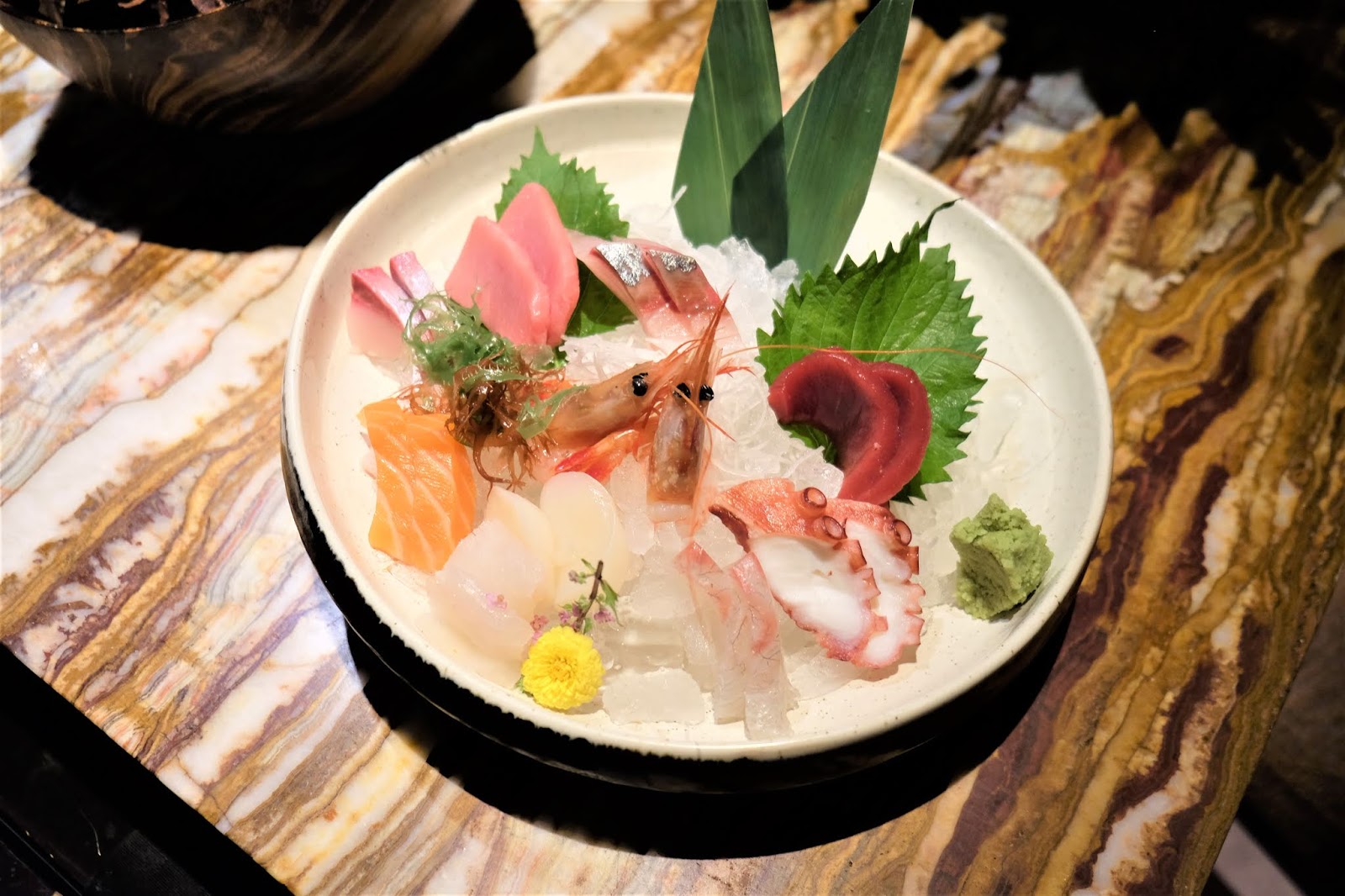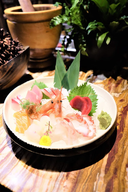 滿滿的一盤,放上了新鮮的三文魚、拖羅、油甘魚、吞拿魚、八爪魚、甜蝦、池魚及帆立貝,蘸點一下芥末及醬油來提鮮,真是人間美味。