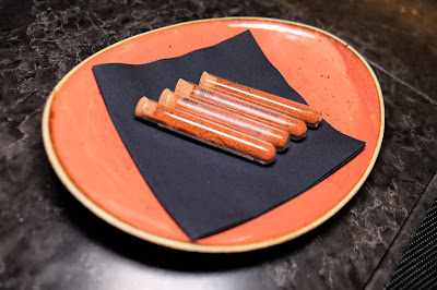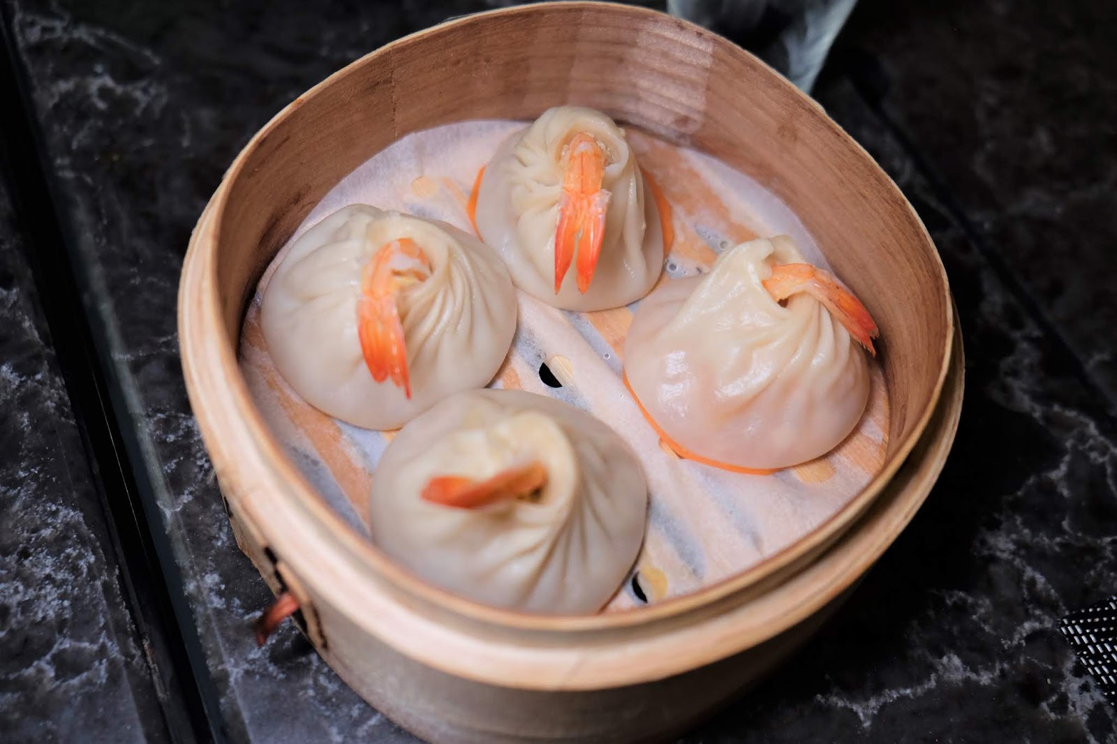 賣相比一般的小籠包更見用心,小小的蝦尾插在小籠包頂,食時另有「吱」管,可直接插入小籠包內注射,充滿了玩味。