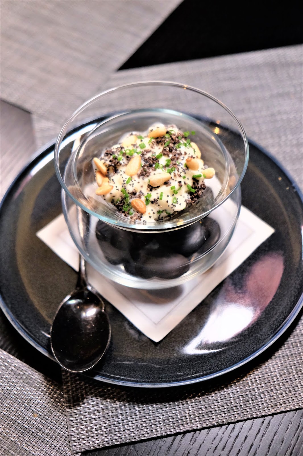 再係面層舖上法國黑松露,還有生雞蛋及煙肉粒,至於醬汁是淡巴馬臣芝士及榛子粒打成醬,食之前拌勻,口感豐腴。
