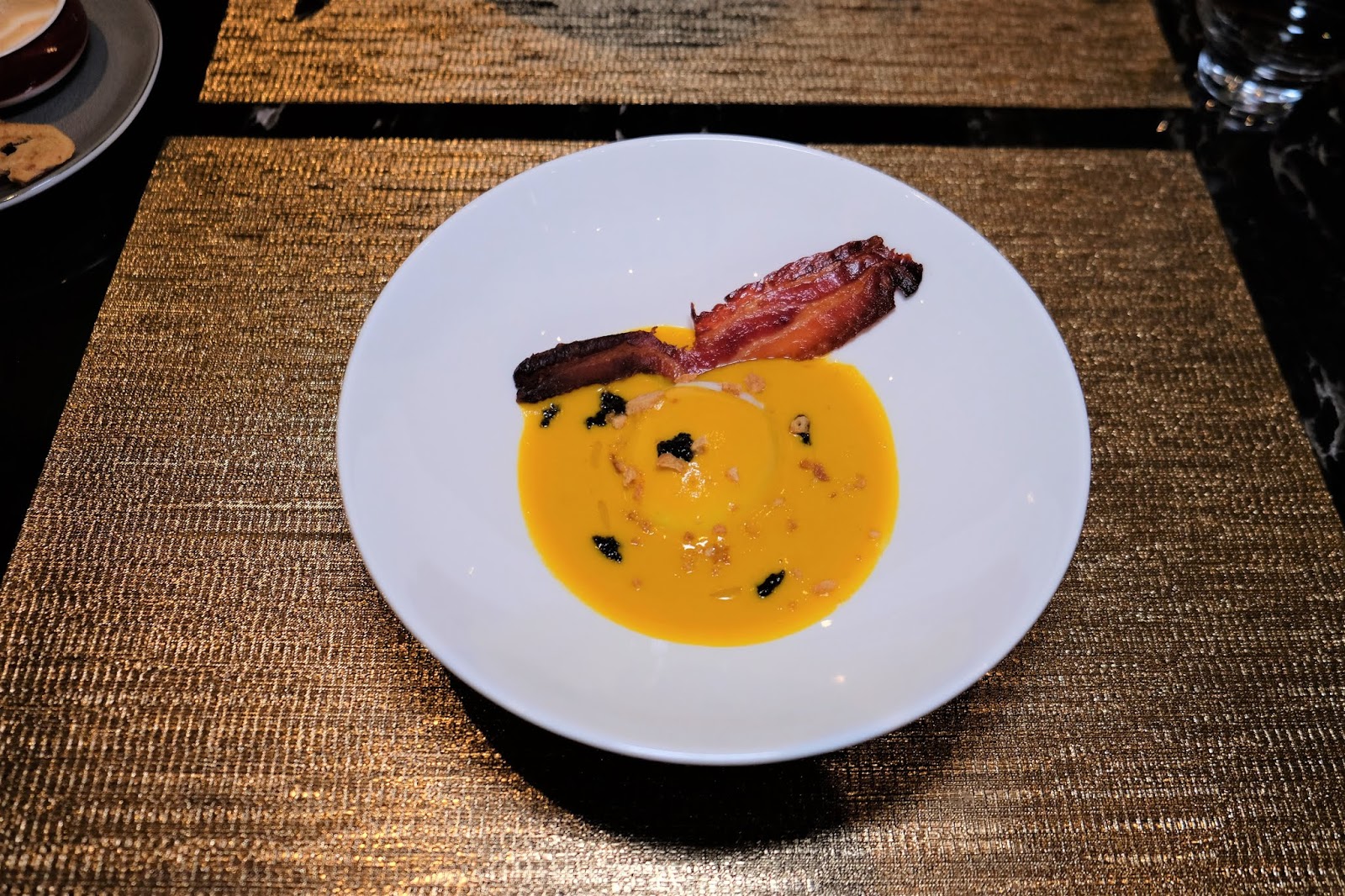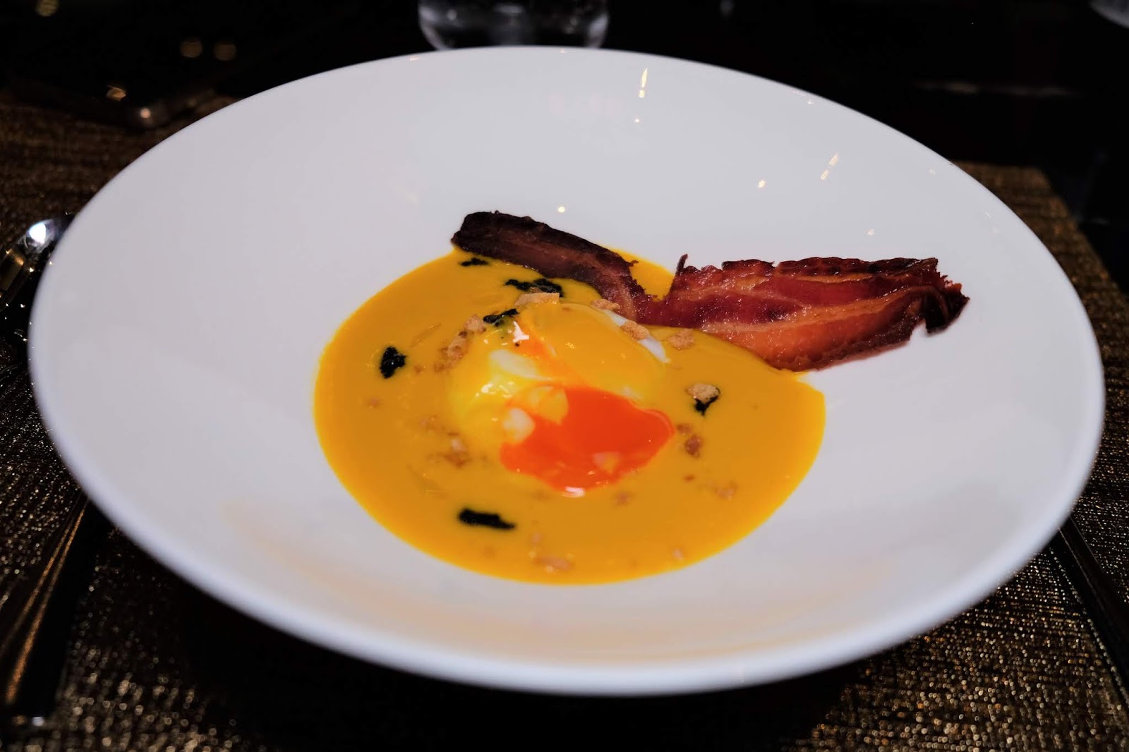 由日本豐洲市場直送鱸魚,同樣以慢煮方式處理,魚肉更覺幼嫩,醬汁是日本清酒、味醂及日式麵豉煮成,芳香馥郁又甜美。